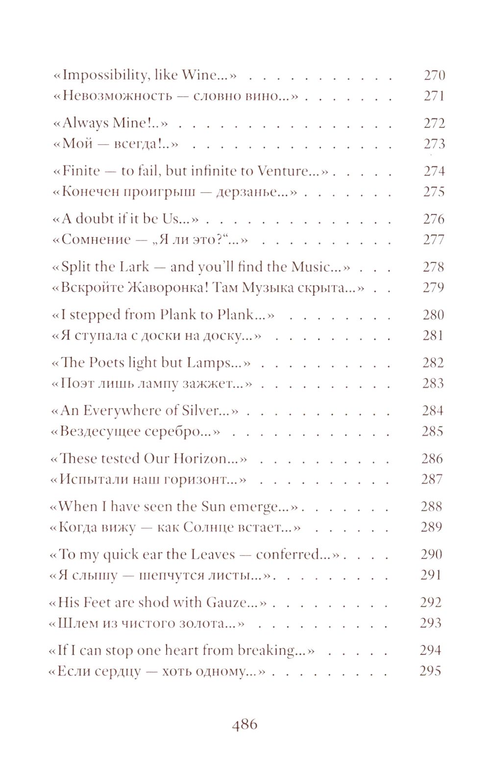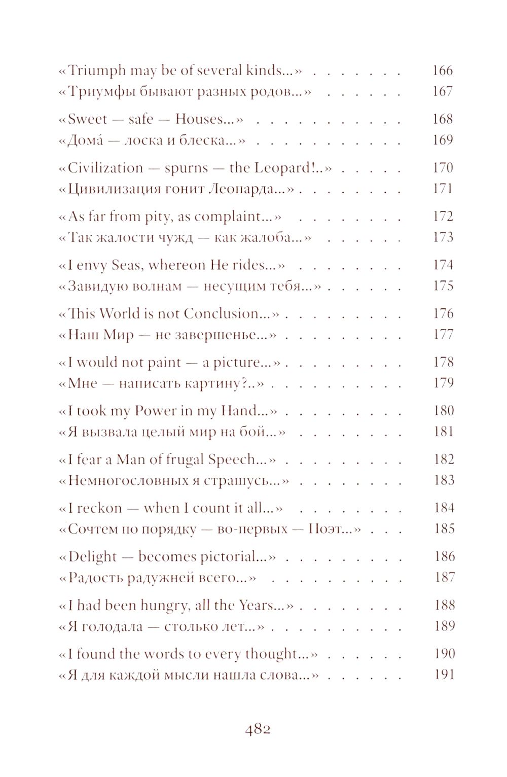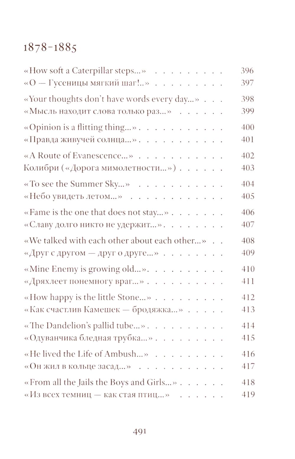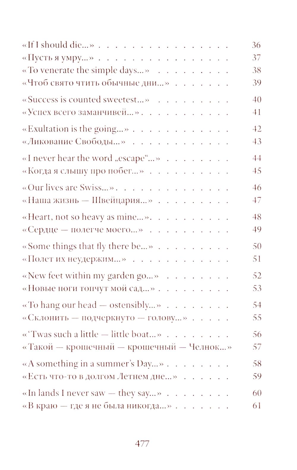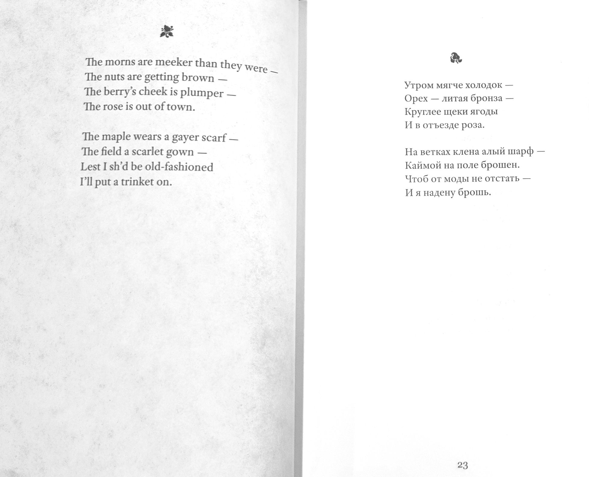 Emily Dickinson (1830–1886) was an American poet whose life remains shrouded in mystery. Her poetic vision is woven from subtle and deliberately opaque images. Her poetry contains a sharp intensity of feelings and stylistic restraint. The poems are presented in the original and in Vera Markova’s translation. Vera Markova (1907–1995) was a poet and translator, philologist, and researcher of classical Japanese literature. The similarity of their creative destinies creates a special connection between the original and the translation, allowing the latter to penetrate the depths of poetic thought with exceptional sensitivity.