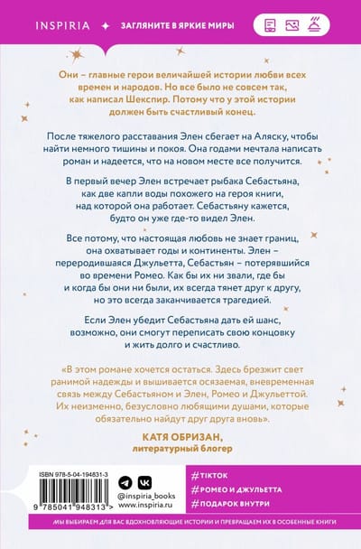 They are the protagonists of the greatest love story of all time. But it wasn't exactly as Shakespeare wrote it. Because this story should have a happy ending. After a difficult breakup, Ellen escapes to Alaska to find some peace and quiet. She has been dreaming of writing a novel for years and hopes it will work out in the new place. On her first night, Ellen meets Sebastian, a fisherman who looks just like the hero of the book she is working on. Sebastian feels as if he has seen Hélène somewhere before. That's because true love knows no boundaries, it spans years and continents. Hélène is Juliet reborn, Sebastian is Romeo lost in time. Whatever their names, wherever and whenever they are, they are always drawn to each other, but it always ends in tragedy. If Hélène convinces Sebastian to give her a chance, perhaps they can rewrite their ending and live happily ever after.