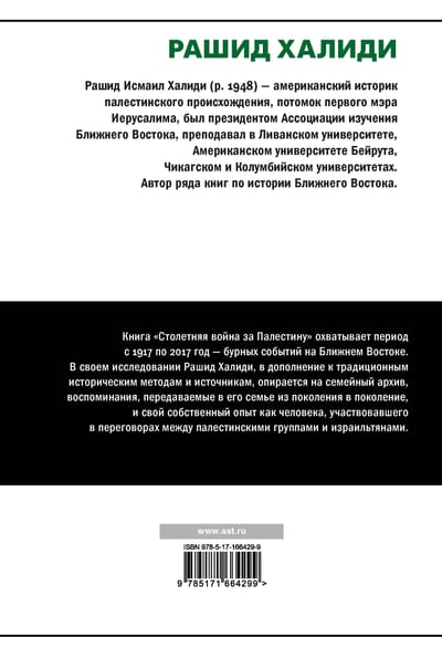 The Hundred Years' War for Palestine covers the period from 1917 to 2017 - the tumultuous events in the Middle East. In addition to traditional historical methods and sources, Rashid Khalidi draws on family archives, memories passed down in his family from generation to generation, and his own experiences as a person involved in negotiations between Palestinian groups and Israelis.