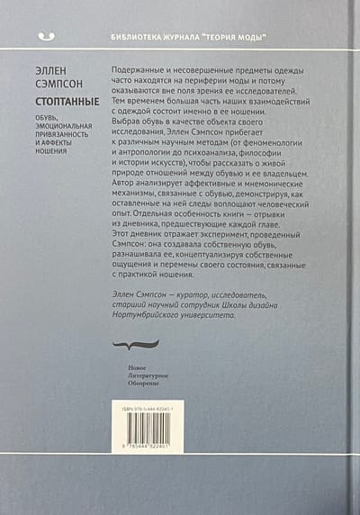 Second-hand and imperfect garments are often on the periphery of fashion and therefore out of sight of its researchers. Meanwhile, the majority of our interactions with clothes consist of wearing them. Choosing shoes as the object of her study, Ellen Sampson draws on a variety of scientific methods (from phenomenology and anthropology to psychoanalysis, philosophy, and art history) to reveal the lived nature of the relationship between shoes and their wearer. The author analyzes the affective and mnemonic mechanisms associated with shoes, demonstrating how the marks left on them embody human experience. A special feature of the book is the diary excerpts that precede each chapter. This diary reflects an experiment conducted by Sampson: she created her own shoes and wore them, conceptualizing her own sensations and changes in her state of mind associated with the practice of wearing them. Ellen Sampson is a curator, researcher and Senior Research Fellow at Northumbria University's School of Design.