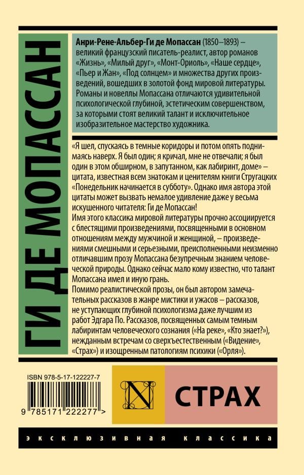 In addition to realistic prose, he was the author of wonderful stories in the genre of mysticism and horror - stories, not inferior to the depth of psychology even the best of the works of Edgar Poe. Stories devoted to the darkest labyrinths of human consciousness ("On the River", "Who Knows?"), unexpected encounters with the supernatural ("Vision", "Fear") and sophisticated pathologies of the psyche ("Orla").