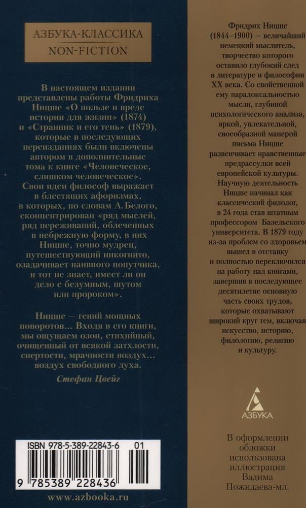 Friedrich Nietzsche (1844-1900) - the greatest German thinker, whose work left a deep mark on the literature and philosophy of the XX century. "Thus Spoke Zarathustra", "On the Other Side of Good and Evil", "The Fall of the Idols", "The Will to Power". - These and other works have secured for Nietzsche scandalous glory of the man who overthrows the generally recognized authorities. With his inherent paradoxicality of thought, depth of psychological analysis, fascinating and vivid style of writing, Nietzsche debunks the moral prejudices of all European culture. The present edition includes the works "On the Usefulness and Harm of History for Life" (1874) and "The Wanderer and His Shadow" (1879), which in subsequent reprints were included by the author in additional volumes to the book "Human, Too Human". The philosopher expresses his ideas in brilliant aphorisms, which, according to A. White, concentrate a number of thoughts, a number of experiences, clothed in a careless form, in them Nietzsche, like a wise man traveling incognito, puzzles the naive fellow traveler, and the latter does not know whether he is dealing with a madman, a jester or a prophet.