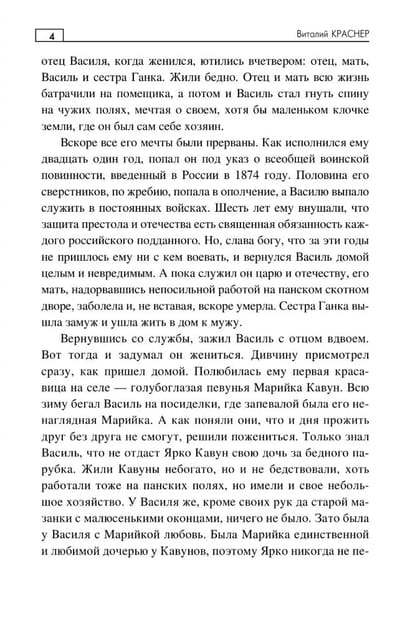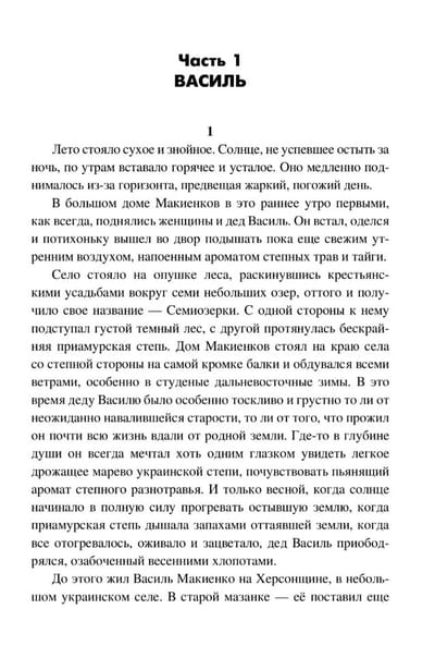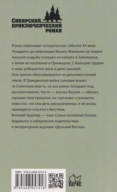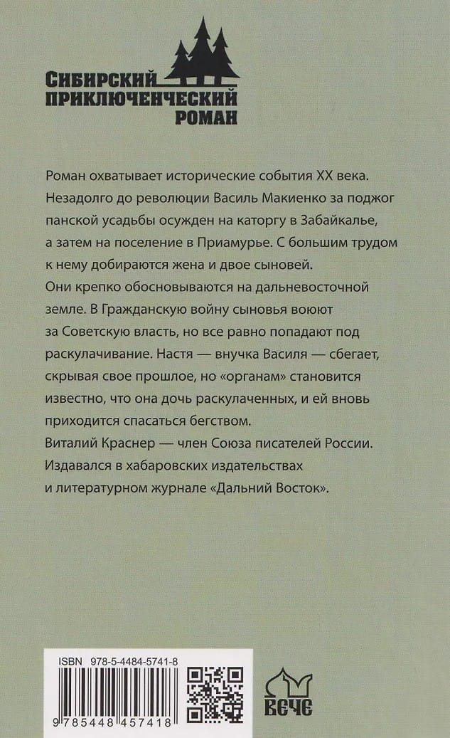The novel covers the historical events of the 20th century. Shortly before the Revolution, Vasily Makiyenko was sentenced to hard labor in Transbaikalia for arson of a nobleman's estate, and then to a settlement in the Amur region. His wife and two sons made their way to him with great difficulty. They established themselves firmly in the Far East. During the Civil War, the sons fought for Soviet power but were still subjected to dispossession. Nastya, Vasily's granddaughter, escapes, hiding her past, but the authorities discover she is the daughter of dispossessed kulaks, and she is forced to flee again. Vitaly Krasner is a member of the Union of Writers of Russia. His works have been published by Khabarovsk publishing houses and the literary journal "Far East."