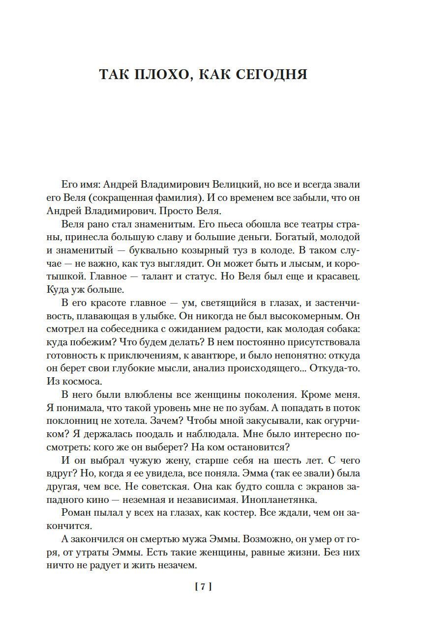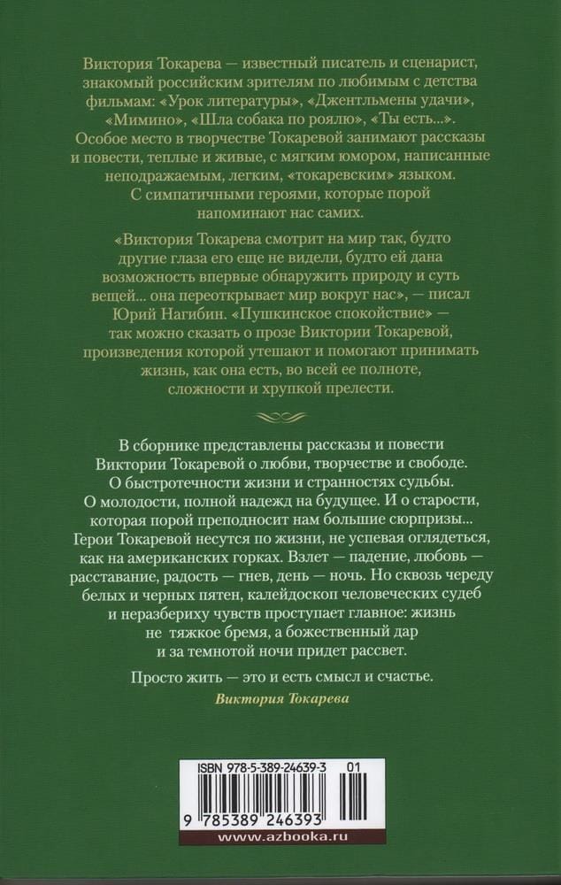 Viktoria Tokareva is a famous writer and screenwriter, familiar to Russian viewers by favorite films from childhood: "A Lesson in Literature", "Gentlemen of Fortune", "Mimino", "There was a dog walking along the piano", "You are...". A special place in the works of Tokareva are stories and novels, warm and lively, with mild humor, written inimitable, easy, "Tokarevsky" language. With sympathetic characters who sometimes remind us of ourselves. "Victoria Tokareva looks at the world as if other eyes have not yet seen it, as if she was given the opportunity to discover for the first time the nature and essence of things .... she rediscovers the world around us," wrote Yuri Nagibin. "Pushkin's tranquility" - so we can say about the prose of Victoria Tokareva, whose works comfort and help to accept life as it is, in all its fullness, complexity and fragile charm. The edition includes prose works by Victoria Tokareva, including the novels "An Accidental Connection", "My Men", "Houses Stand Longer Than People", the stories "Mulya, Who Did You Bring?", "Letter", "Unlucky Fima", "All Around One Deception", "Bastards are also pitiful" and others.