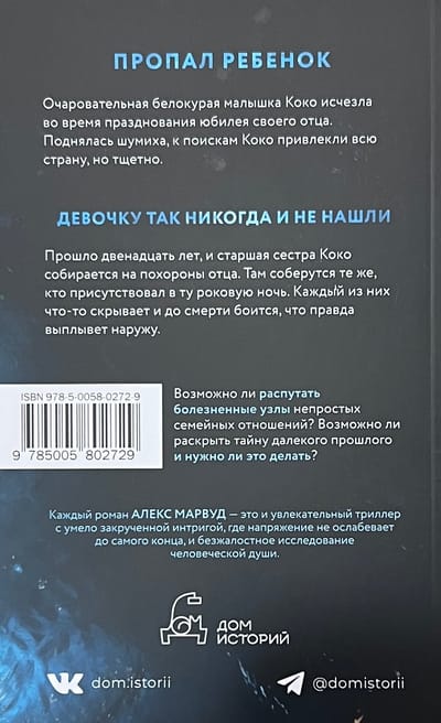 Missing child. Charming blond baby girl Coco disappeared during the celebration of her father's anniversary. A fuss was raised, the whole country was involved in the search for Koko, but in vain - the girl was never found. Twelve years have passed, and Koko's older sister is going to her father's funeral. The same people who were present that fateful night will gather there. Each of them is hiding something and is scared to death that the truth will come out. Is it possible to untangle the painful knots of complicated family relationships? Is it possible to unravel the mystery of the distant past, and should it be done? Alex Marwood - a master of psychological thriller - knows how to keep the reader in suspense until the last page.