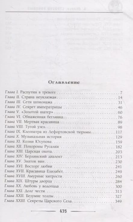 A stunning story of court intrigue and passionate love, of espionage and valor, of female tenderness and male strength. In the center of events - a handsome athlete Count Sokolov and spy maid of honor Maria Vasilchikova, Empress Alexandra Fyodorovna and Tsar Nicholas II, the mysterious Grigory Rasputin and his cunning killer Felix Yusupov. At the heart of - true events that took place during the First World War on the eve of the collapse of the Russian Empire.