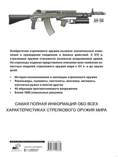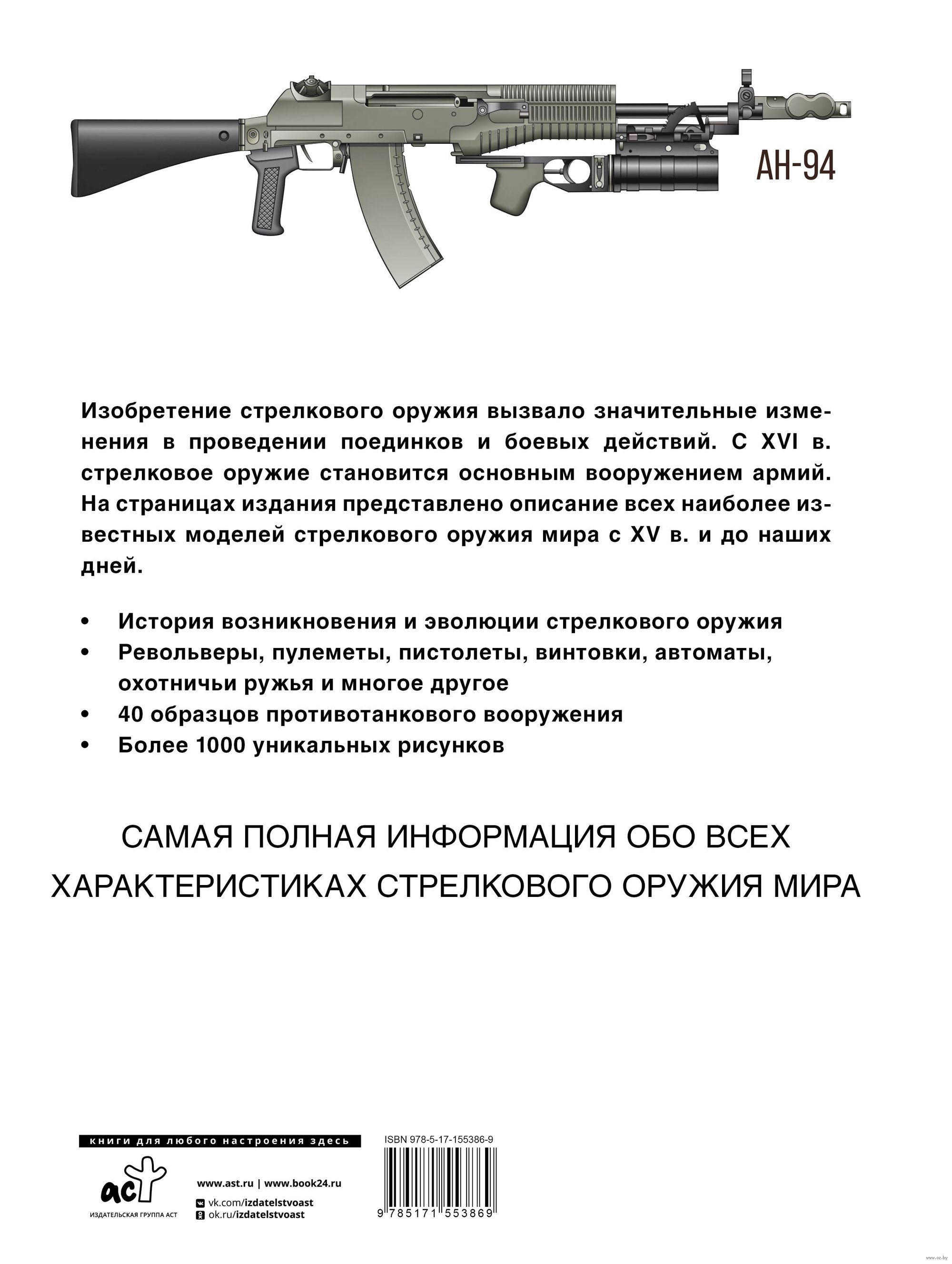 An illustrated guide to small arms from the 15th century to the present day, from the first arquebuses to modern grenade launchers. It features all the world's most famous small arms models, including the Colt, Smith & Wesson, AK and TT, Česká sbrojevka, Winchester, Mauser, and many others. Hundreds of color illustrations are accompanied by detailed information on the country of manufacture, caliber, weight, barrel length, range and muzzle velocity of the bullet. The book is addressed to a wide range of readers interested in military history and the history of small arms.