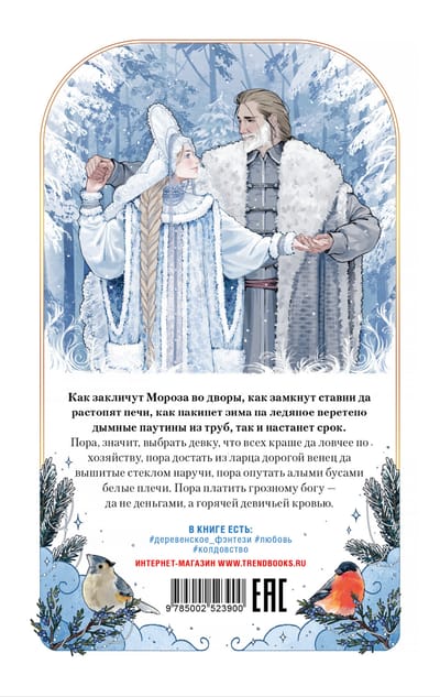 As Frost calls into the courtyards, as the shutters are closed and the stoves are stoked, as winter casts smoky webs of chimneys over the icy spindle, the time will come. It's time, then, to choose the most beautiful and most skilled maiden of all, time to take from the casket the precious crown and glass-embroidered bracers, time to entwine her white shoulders with scarlet beads. Time to pay the formidable god. And not with money, but with hot maiden blood.