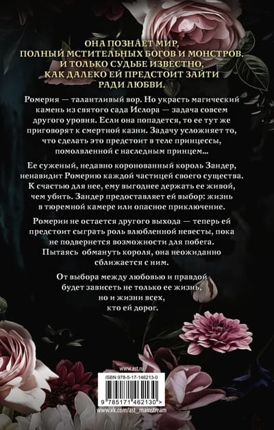 Romeria is a skilled thief. But stealing a magical stone from the sacred garden of Islor is a task on a whole other level. If she is caught, she will be sentenced to death on the spot. To make matters worse, she will have to do it in the body of a princess engaged to the crown prince… Her betrothed, the recently crowned King Zander, hates Romeria with every fiber of his being. Luckily for her, it is more profitable for him to keep her alive than to kill her. Zander gives her a choice: life in a prison cell or a dangerous adventure. Romeria has no other choice but to play the role of a bride in love until an opportunity to escape presents itself. Trying to deceive the king, she unexpectedly becomes close to him. The choice between love and truth will determine not only her life, but also the lives of everyone she cares about.