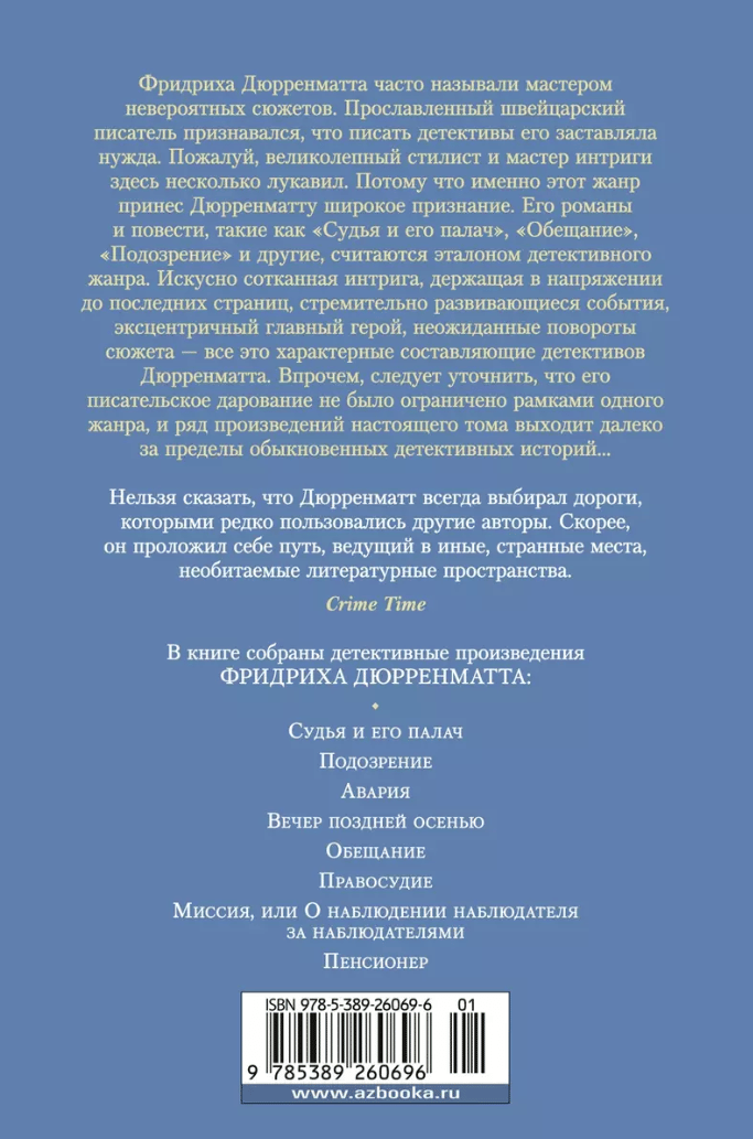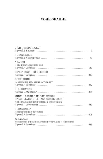 Friedrich Dürrenmatt was often called the master of improbable plots. The famous Swiss writer admitted that he was forced to write detectives in need. Perhaps, a great stylist and master of intrigue here is a bit of a liar. Because it is this genre has brought Dürrenmattu wide recognition. His novels and novellas, such as "The Judge and His Executioner", "The Promise", "Suspicion" and others, are considered the standard of the detective genre. Skillfully woven intrigue, keeping in suspense until the last pages, rapidly developing events, eccentric protagonist, unexpected plot twists - all of these are characteristic components of detectives Durrenmatta. However, it should be clarified that his writing talent was not limited to the framework of a single genre, and a number of works in this volume goes far beyond the usual detective stories ...