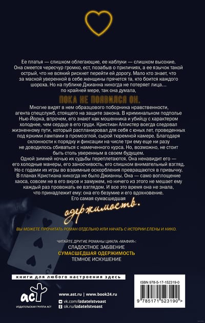 Her dresses are too tight, her heels too high. She laughs too loudly, eats with no decorum, and her tongue is so sharp that not everyone would risk crossing her path. Few people know that behind the mask of a confident woman hides someone who is afraid of every rustle. But in public, Gianna will never lose face...at least that's what she thought until he showed up. Many see him as a model champion of morality, a secret service agent standing up for the law. In the criminal underworld of New York, however, he is known as a crook and a killer with a character colder than the heart in his chest. Christian Allister has always followed the life path he planned for himself from a young age spent under bright lights in a dank, damp prison cell. Thanks to his penchant for order and his fixation on the number three, he had never once strayed from his planned course. But perhaps he shouldn't be so sure of his future. One winter night their fates intertwine. She hates him-his cold manners, his arrogance, his overly attentive gaze. But as the years pass, their games of mutual insults become a habit. Gianna was never in Christian's plans. She's the very embodiment of chaos, not at all his type, and married, but none of that stops him from giving her a glance every time he sees her off. And all this time she didn't know she belonged to him: she's his madness and his inspiration. His craziest obsession.