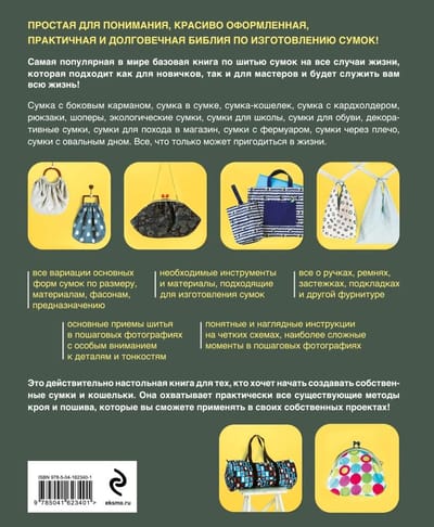 For the first time in Russian, a comprehensive encyclopedia of handbags from Japanese masters, which has already conquered many countries! Easy to understand, beautifully designed, practical and durable bible of handbag making! A huge collection of cutouts of almost all styles of bags with variations of sizes and materials, with detailed instructions on the sequence of cutting, sewing, assembly and finishing. The book, thanks to which you can create for yourself or to order absolutely any bag - from a smart clutch to a capacious backpack!