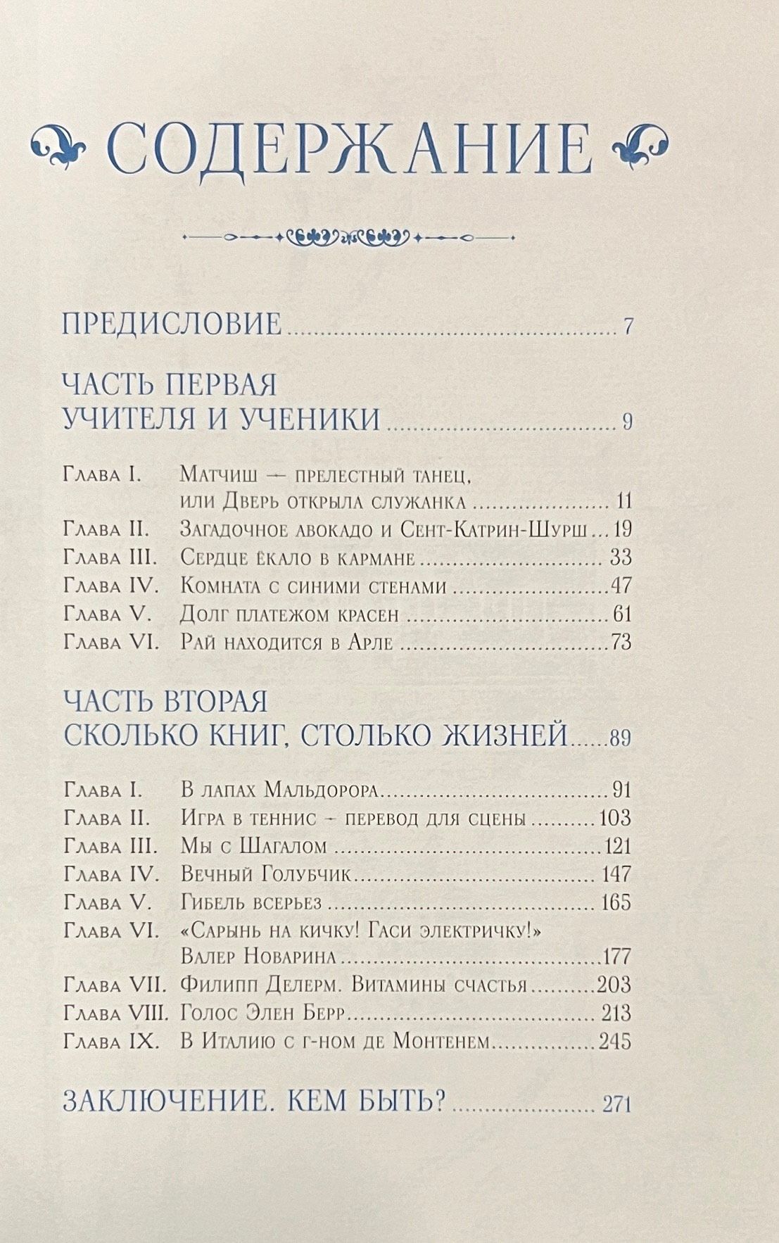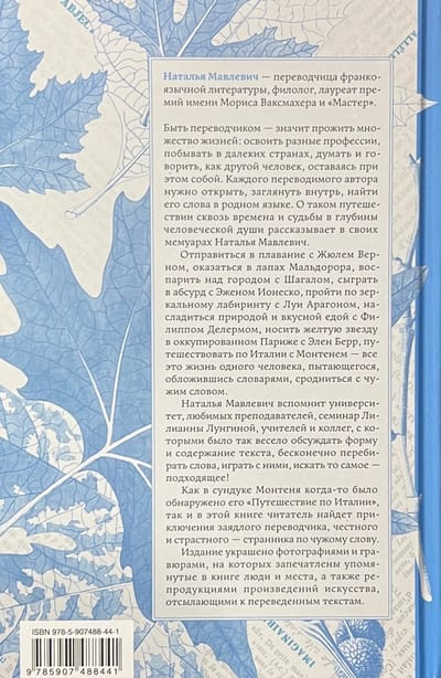 To be a translator means to live many lives: to master different professions, to visit distant countries, to think and speak like another person, while remaining yourself. Each translated author has to be discovered, to look inside, to find his words in his native language. Natalia Mavlevich tells about such a journey through time and fate into the depths of the human soul in her memoirs. To set sail with Jules Verne, to find oneself in the clutches of Maldoror, to soar above the city with Chagall, to play absurdity with Eugène Ionesco, to walk through the mirror labyrinth with Louis Aragon, to enjoy nature and delicious food with Philippe Delerme, to wear a yellow star in occupied Paris with Hélène Berre, to travel through Italy with Montaigne - all this is the life of one person, trying, having piled up dictionaries, to get close to another's word. Natalia Mavlevich will remember the university, her favorite teachers, Lilianna Lungina's seminar, teachers and colleagues with whom it was so much fun to discuss the form and content of the text, endlessly going through words, playing with them, looking for the right one! As in Montaigne's trunk was once discovered his "Journey through Italy", so in this book the reader will find the adventures of an avid translator, honest and passionate - a wanderer through other people's words. The edition is decorated with photographs and engravings depicting the people and places mentioned in the book, as well as reproductions of works of art referring to the translated texts.