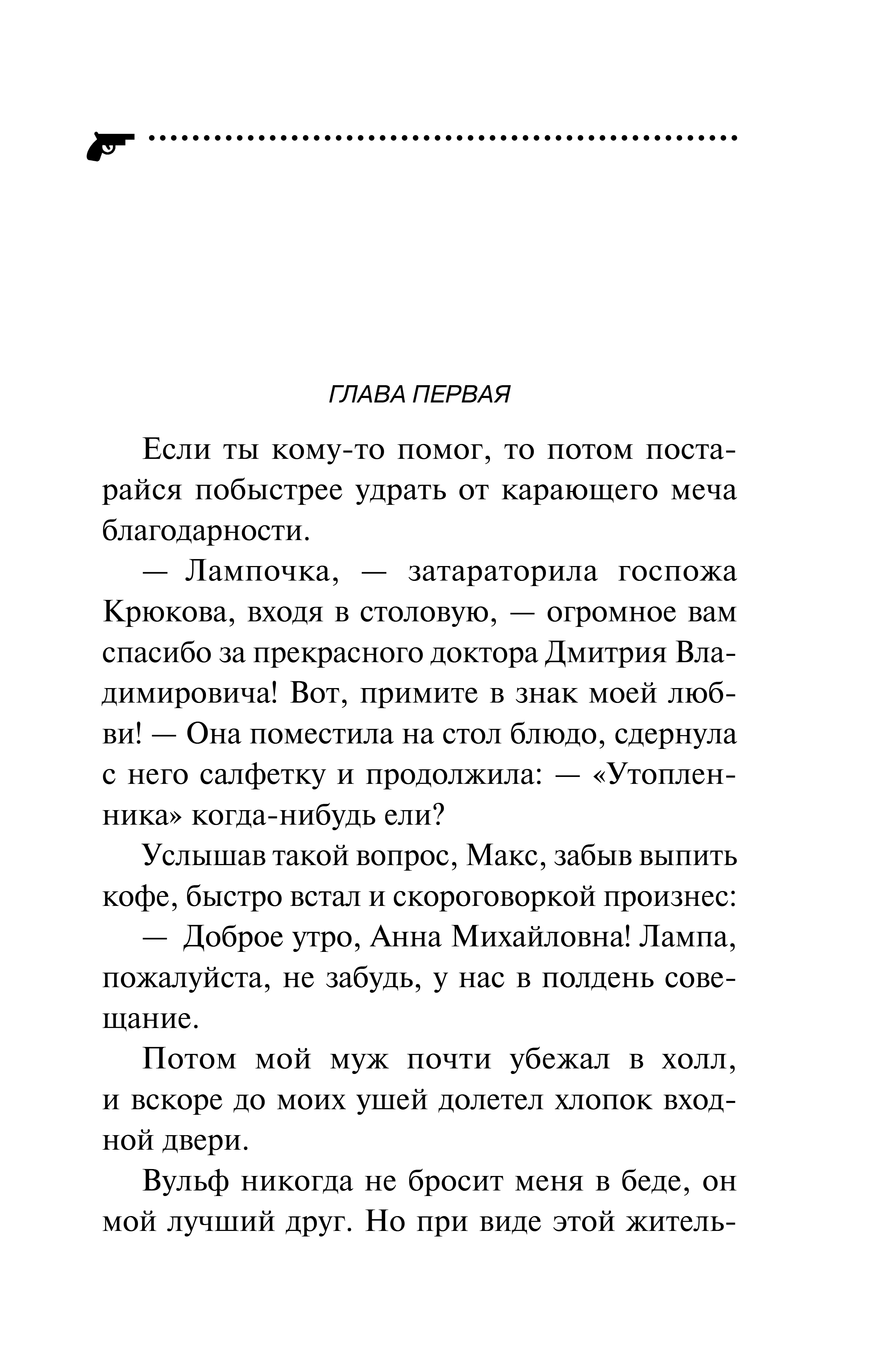 If you've helped someone, try to escape the punishing sword of gratitude as quickly as possible. Evlampia Romanova sometimes feels like she's living in a tent on top of a volcano, constantly immersed in a lava flow. And now, her friend and neighbor has an unexpected visit from her mother-in-law, whom the daughter-in-law doesn't know, and whose son hasn't seen her in years. Lampa decides to help Gortenzia in a most original way, and now the Romanovas' home is in complete disarray. But fate has other plans for Lampa: a particularly complicated matter has arisen at work. Vasily Svetov has contacted the Wolf agency and asked them to find his friend, businessman Sergei Akulov, who seems to be dead, but seems to be alive...