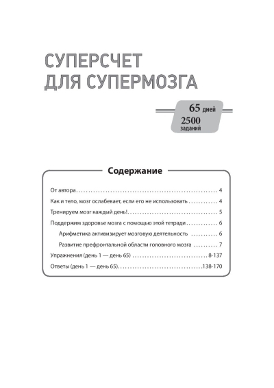 The brain, like muscles, weakens without exercise. That's why it's so important to put it to work every day. The prefrontal cortex distinguishes humans from animals and is the most important part of the human brain. Its development is inextricably linked to improved mental performance and ultimately longevity. The activity of the prefrontal cortex is stimulated by writing, reading aloud, and counting. This notebook presents various math examples based on common arithmetic operations. They stimulate your brain activity. The effectiveness of the exercises in this notebook has been proven by experience.