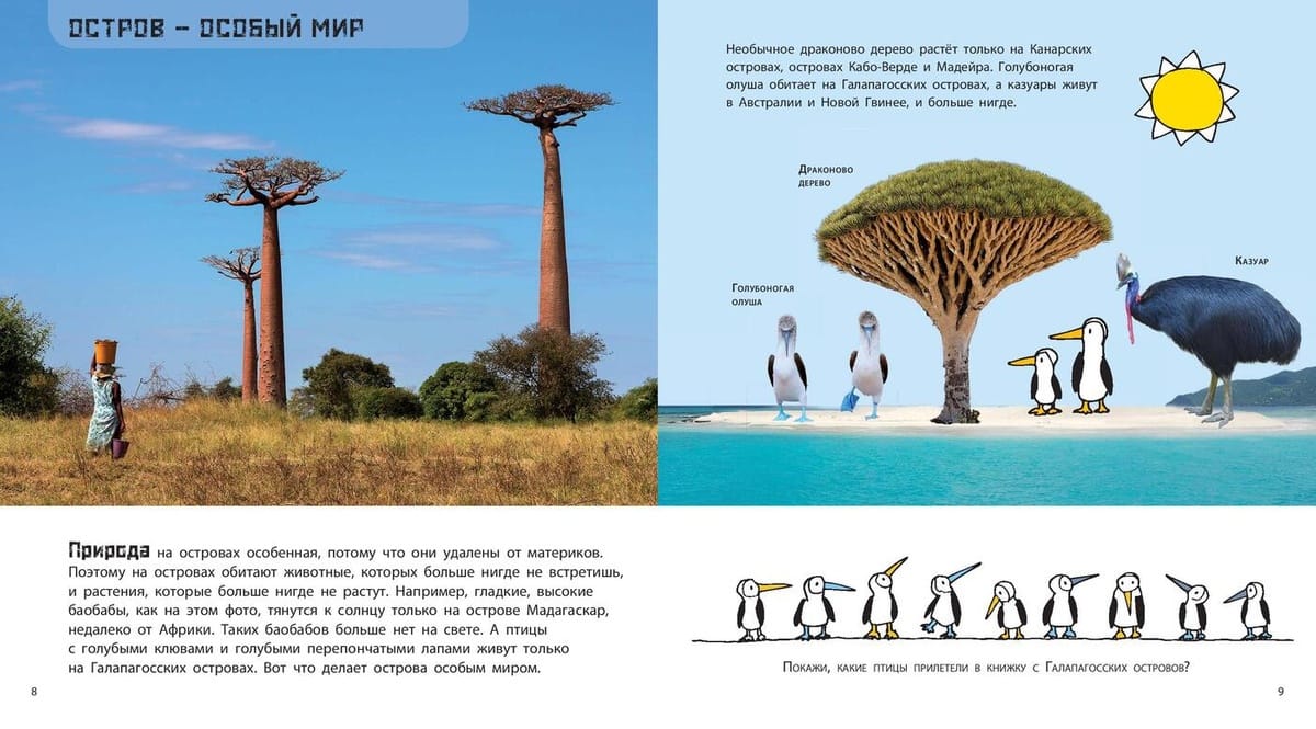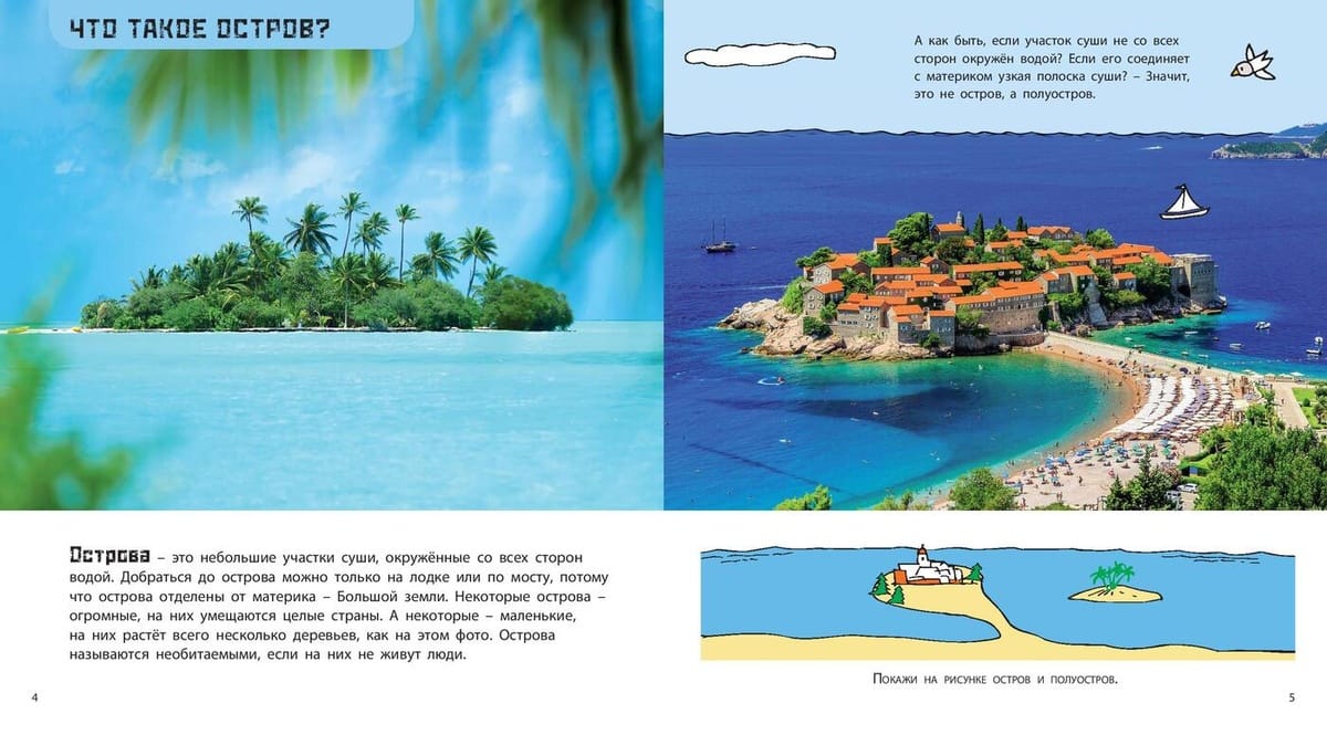 A small piece of land in the middle of a river, sea or ocean is called an island. How do islands come to be? What is so special about them? What are they like, who lives on them, and what grows on them? Japan, Iceland, Easter Island, Hawaii, the Galapagos Islands, Madagascar - the most beautiful corners of the Earth. Informative stories with beautiful photographs and fun drawings for children ages five and up.