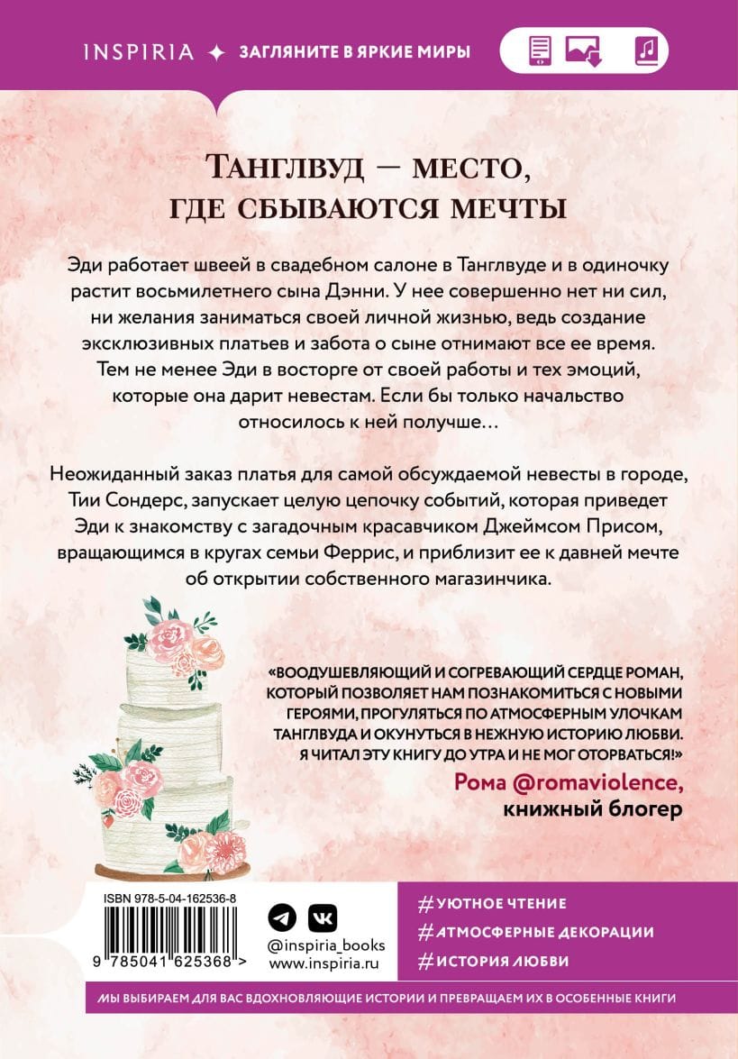 Edie works as a seamstress in a bridal salon in Tanglewood and raises her eight-year-old son, Danny, alone. She has no energy or desire to deal with her personal life, because the creation of exclusive dresses and caring for her son take up all her time. Nevertheless, Edie is delighted with her work and the emotions that she gives brides. If only her bosses would treat her better... An unexpected order for a dress for the most talked-about bride in town, Tia Saunders, sets off a chain of events that will lead Edie to meet the mysterious handsome James Preece, a Ferris family man, and bring her closer to her long-held dream of opening her own store....