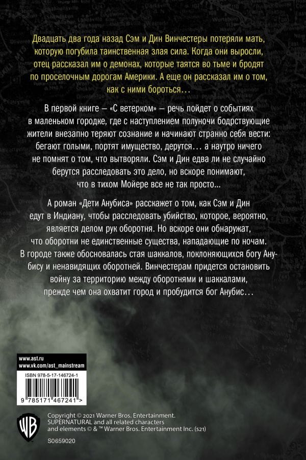 In the first book, "With the Wind" is about the events in a small town, where at midnight, awake residents suddenly lose consciousness and begin to behave strangely: running naked, damaging property, fighting ... and in the morning do not remember anything about what they did. Sam and Dean almost accidentally take to investigate this case, but soon realize that in the quiet Moyer all is not so simple ... And the novel Children of Anubis will tell the story of Sam and Dean traveling to Indiana to investigate a murder that is probably the work of a werewolf. But they soon discover that werewolves aren't the only creatures attacking at night. A pack of Shakkal, who worship the god Anubis and hate werewolves, have also settled in town. Winchester will have to stop a turf war between werewolves and shakkals before it engulfs the town and the god Anubis awakens....
