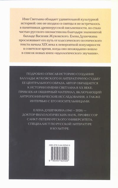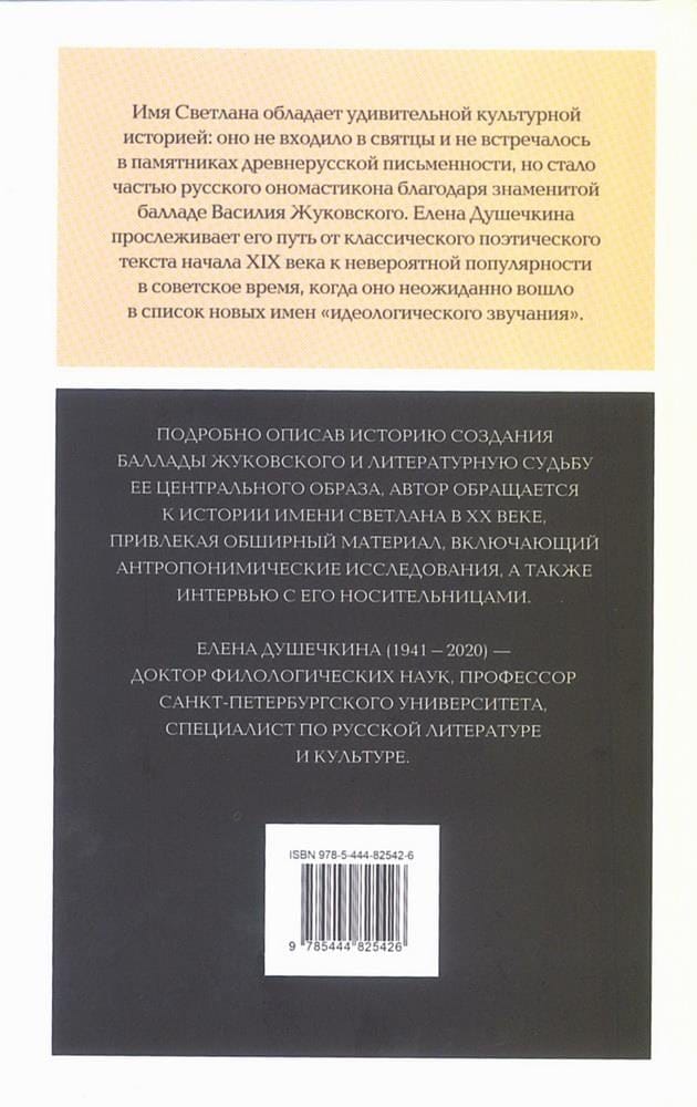 The name of Svetlana has an amazing cultural history: it was not included in the saints and was not found in monuments of ancient Russian writing, but became part of the Russian onomasticon thanks to the famous ballad of Vasily Zhukovsky. Elena Dushechkina traces its path from a classic poetic text of the early nineteenth century to its incredible popularity during the Soviet era, when it unexpectedly entered the list of new names of “ideological sound”. Having described in detail the history of the creation of the Zhukovsky ballad and the literary fate of its central image, the author turns to the history of the name Svetlana in the XX century, attracting extensive material, including anthroponymic research, as well as interviews with its carriers.