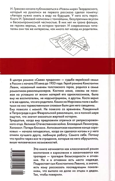 In the center of the novel “Fresh Tradition” is the fate of the Jewish family in Russia from the beginning of the twentieth century to 1953. The hero of the novel Konstantin Levin, named after the Tolstoy hero, was born in a family of romantic revolutionaries. His mother, not at all like the tired mothers of classmates, was not his teacher, not a supervisor, but a friend. Kostya believed in the same ideals as his parents. The stones on the Champ de Mars with their solemn words were sacred to him.