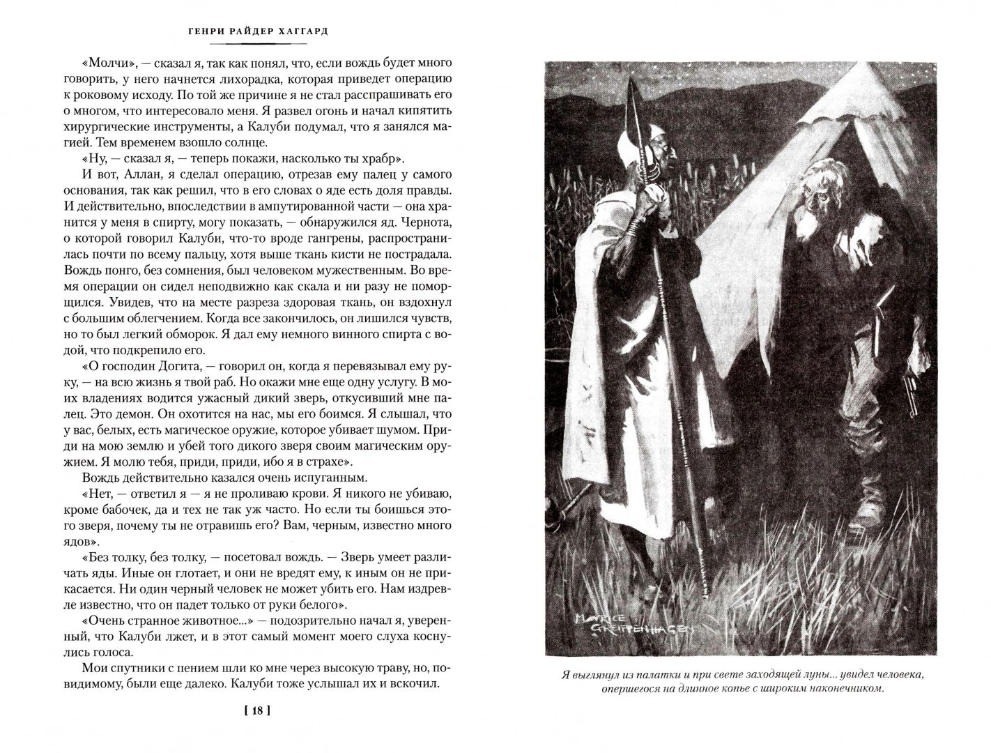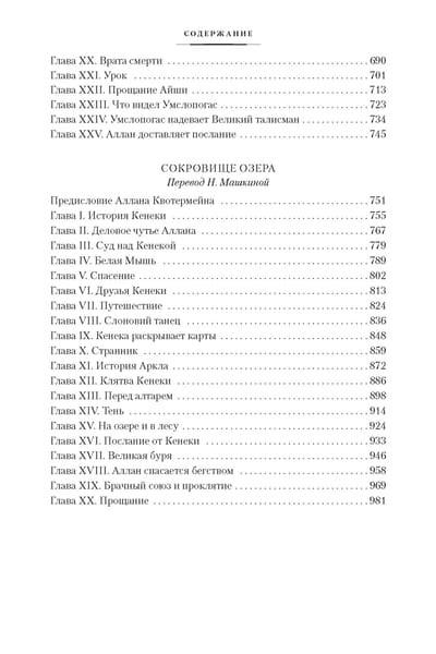 Fearless hunter Allan Quartermain nicknamed Makumazan, which means "the man who rises after midnight", never liked the damp and primness of his native England, preferring the hot, dusty expanse of the African veldt; he was drawn to the uncharted, full of danger lands of the Black Continent, where people live simple-minded and cruel, like all children of nature, where herds of wild buffalo roam and roar at night ferocious lions. This life was to the liking of Kvotermainu - the favorite hero of the wonderful writer Henry Rider Haggard (1856-1925), who dedicated to the brave hunter many books. The cycle of adventures of Allan Quartermain continue with "The Sacred Flower", "A Beast Called How-How", "She and Allan" (the novel is published in a new translation), "The Treasure of the Lake". These works are printed with the English publishers' notes intact. The book is illustrated with classic drawings by Maurice Greifenhagen and wonderful graphics by Elena Shipitsyna.
