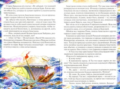 The book tells about the Holy Great Martyr Anastasia Uzoreshitelnitsa in a language accessible to a child. The hagiographic story is told on behalf of the grandmother to the inquisitive granddaughter Nastya. The book ends with a prayer to the saint.