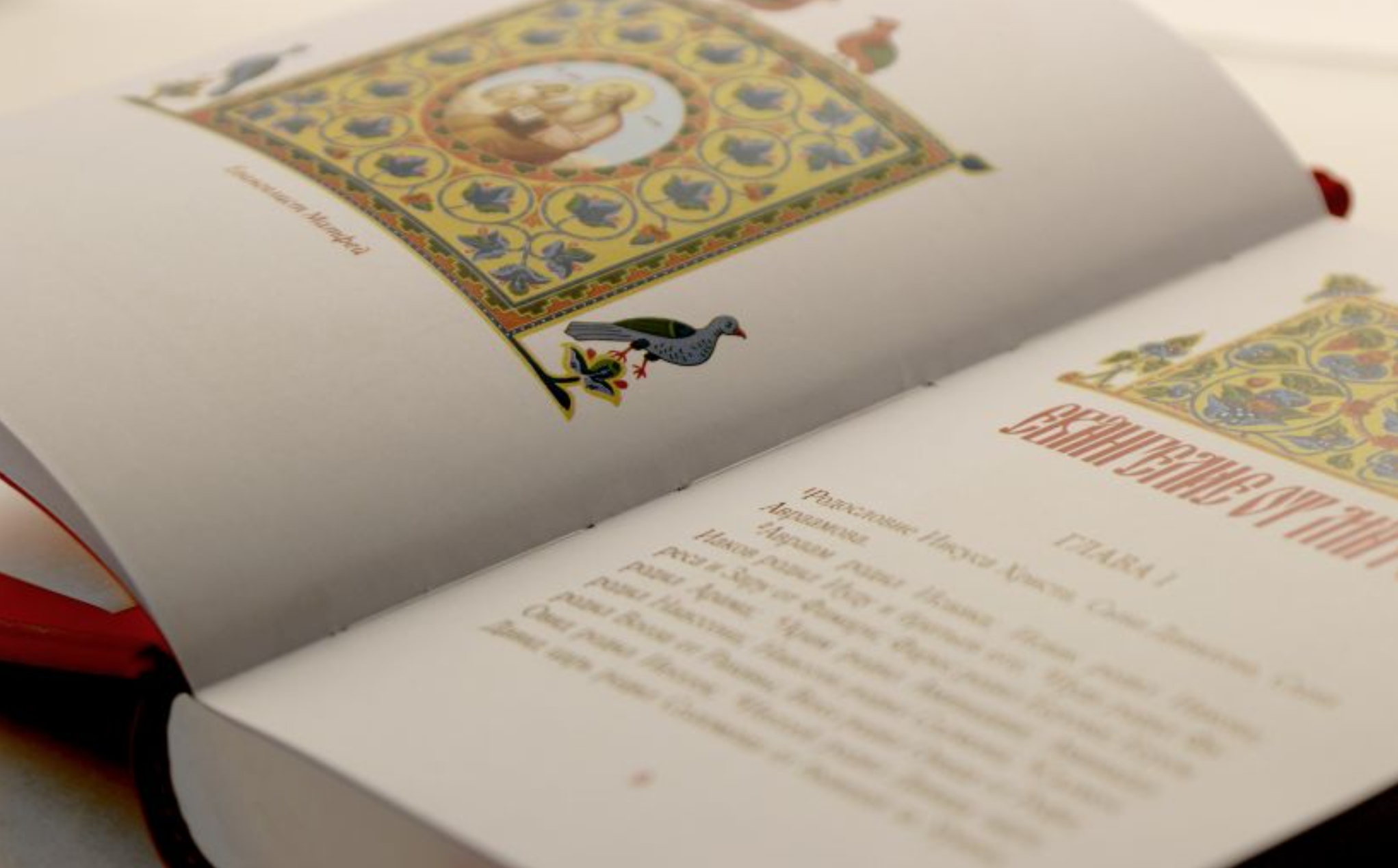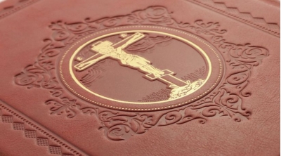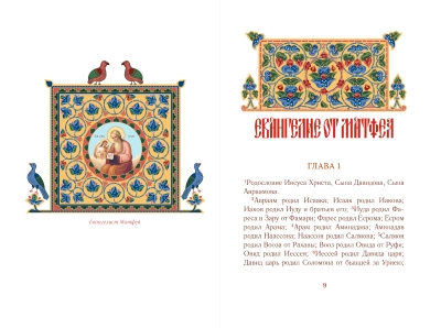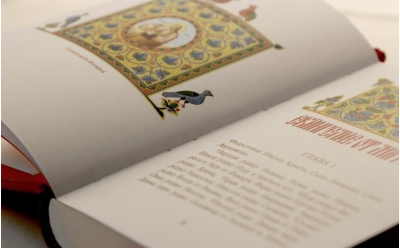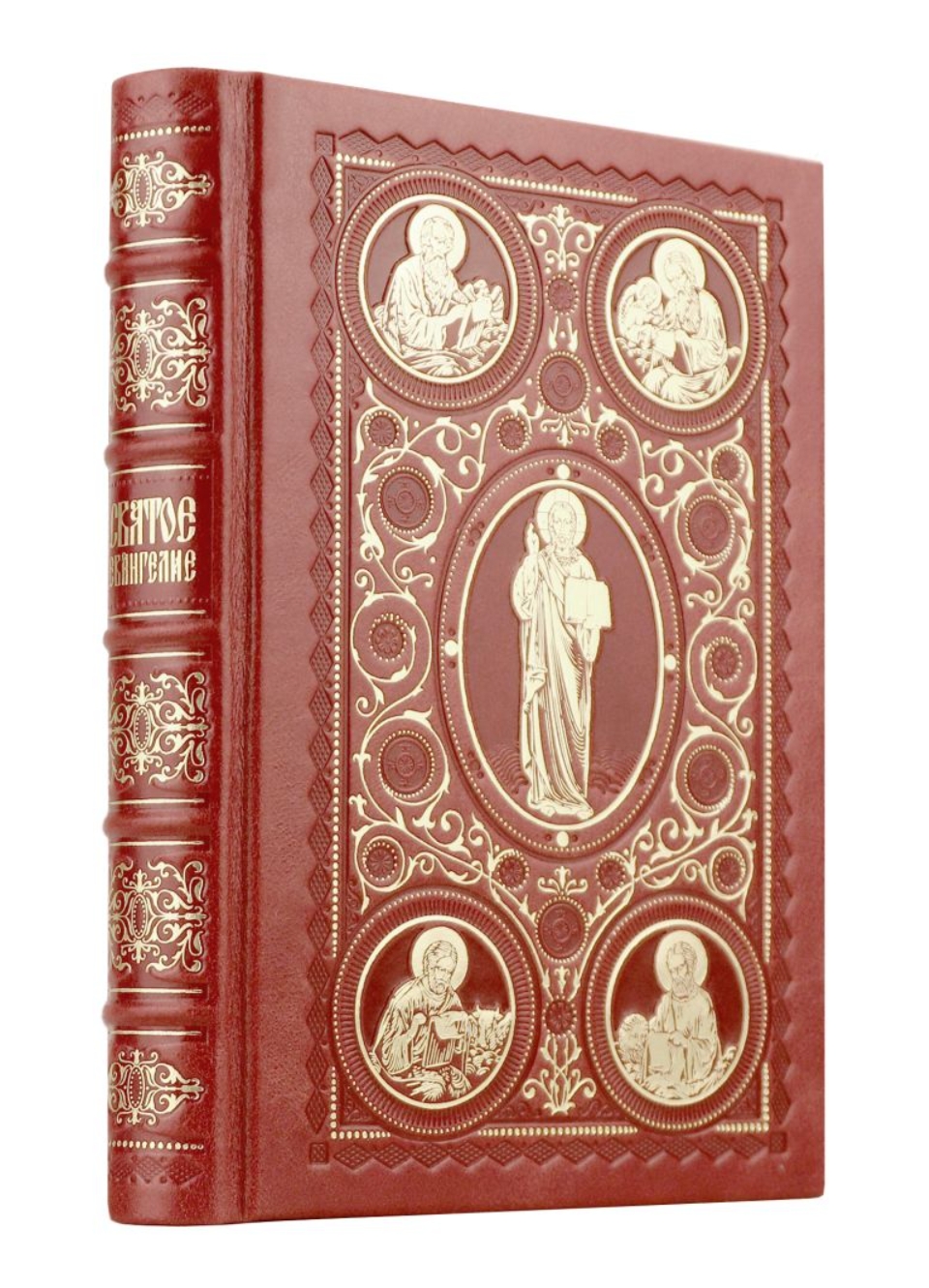 A collector's edition of the Holy Gospel with numerous illustrations. Printed on smooth white paper, hand-sewn, and decorated with Byzantine ornaments, the book is bound in smooth scarlet leather using traditional 19th-century techniques and embellished with exquisite embossing. The endpapers are made of cotton paper, hand-edged, and the headband and ribbon are made of silk. A certificate confirming the uniqueness of the collector's binding is included with each copy and is hand-numbered.