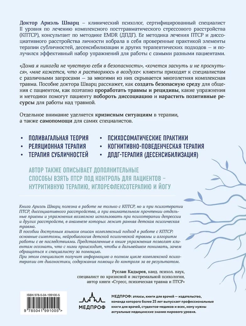 In her practical guide to working with complex post-traumatic stress disorder, Dr. Ariel Schwartz, a clinical psychologist and specialist in C-PTSD, presents a comprehensive treatment method for cases of C-PTSD. Presented in the form of clear therapeutic exercises and questionnaires, theoretical foundations, and case studies, Dr. Schwartz's method will become a useful tool in the arsenal of various professionals working with psychological trauma, from psychologists to psychiatrists. Various approaches are designed to shift the patient's attention from internal experiences and retrospectives to the sensations of their own body and its capabilities in the present moment.