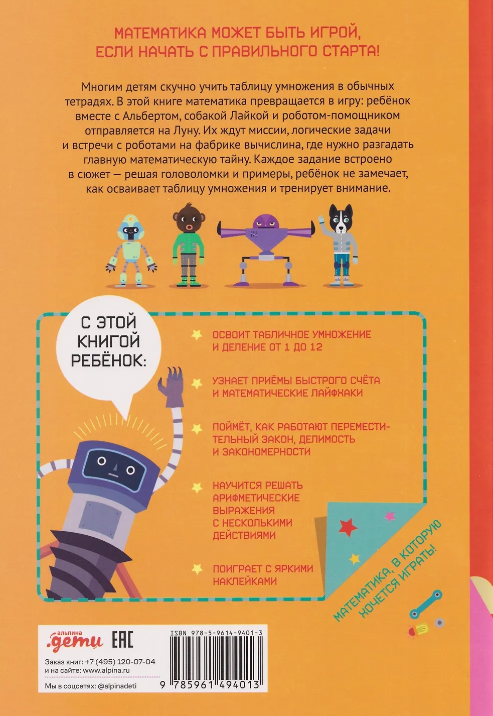 This workbook will help children aged 8 and up learn multiplication tables and division quickly, without fear or boredom. Together with the characters Albert, Laika, and the robot assistant Drug 1, the child will embark on a space journey to the computer factory to restore order and solve the ultimate mathematical mystery.