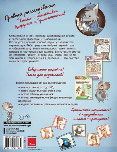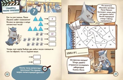 Experienced teachers and psychologists from the University of Padua have created an investigation game that will help deepen the knowledge of mathematics in elementary school students. Unexpected plot twists, colorful characters, comics and stickers-clues will make learning more interesting and effective, and will also help the child get rid of “math anxiety”. With this book, your son or daughter will easily and cheerfully repeat the multiplication table, practice mental arithmetic, solve logical problems and more...