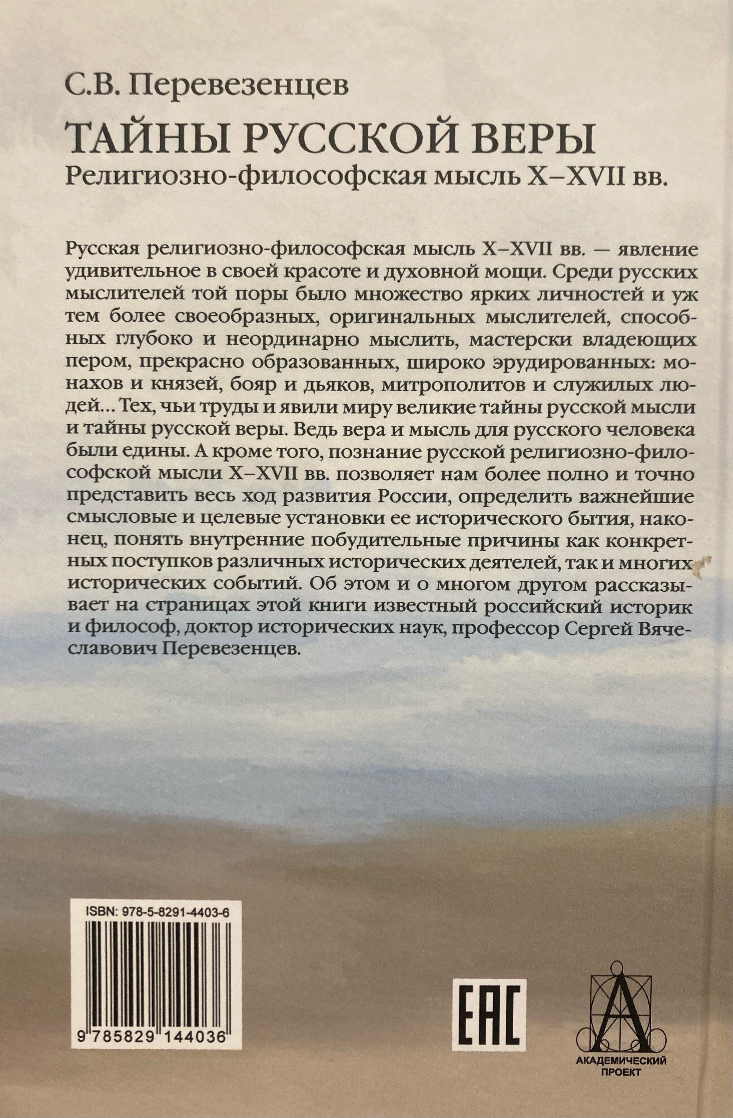 Russian religious and philosophical thought of the 10th-17th centuries is a phenomenon amazing in its beauty and spiritual power. Among the Russian thinkers of that time there were many bright personalities and even more so original, unique thinkers, capable of deep and extraordinary thinking, masterful in wielding a pen, well educated, widely erudite: monks and princes, boyars and clerks, metropolitans and service people ... Those whose works revealed to the world the great secrets of Russian thought and the secrets of Russian faith. After all, faith and thought were one for a Russian. And besides, knowledge of Russian religious and philosophical thought of the 10th-17th centuries allows us to more fully and accurately imagine the entire course of Russia's development, to determine the most important semantic and target settings of its historical existence, and finally, to understand the internal motivating reasons for both the specific actions of various historical figures and many historical events. The famous Russian historian and philosopher, Doctor of Historical Sciences, Professor Sergei Vyacheslavovich Perevezentsev talks about this and much more on the pages of this book.