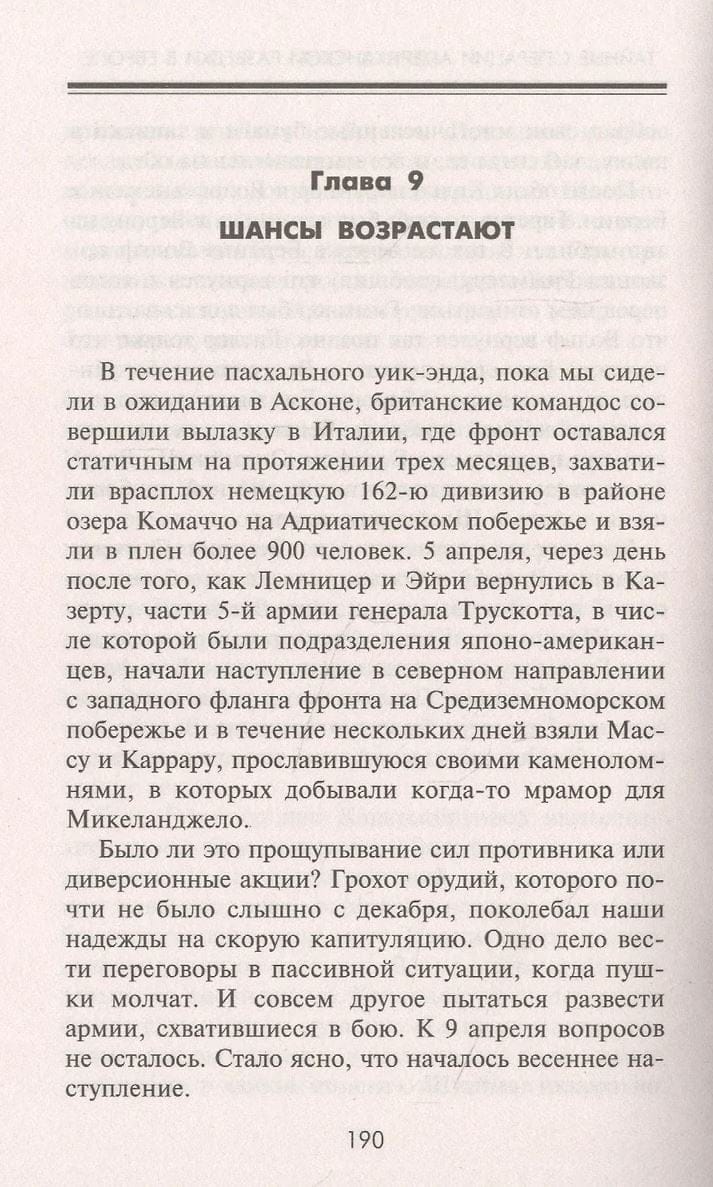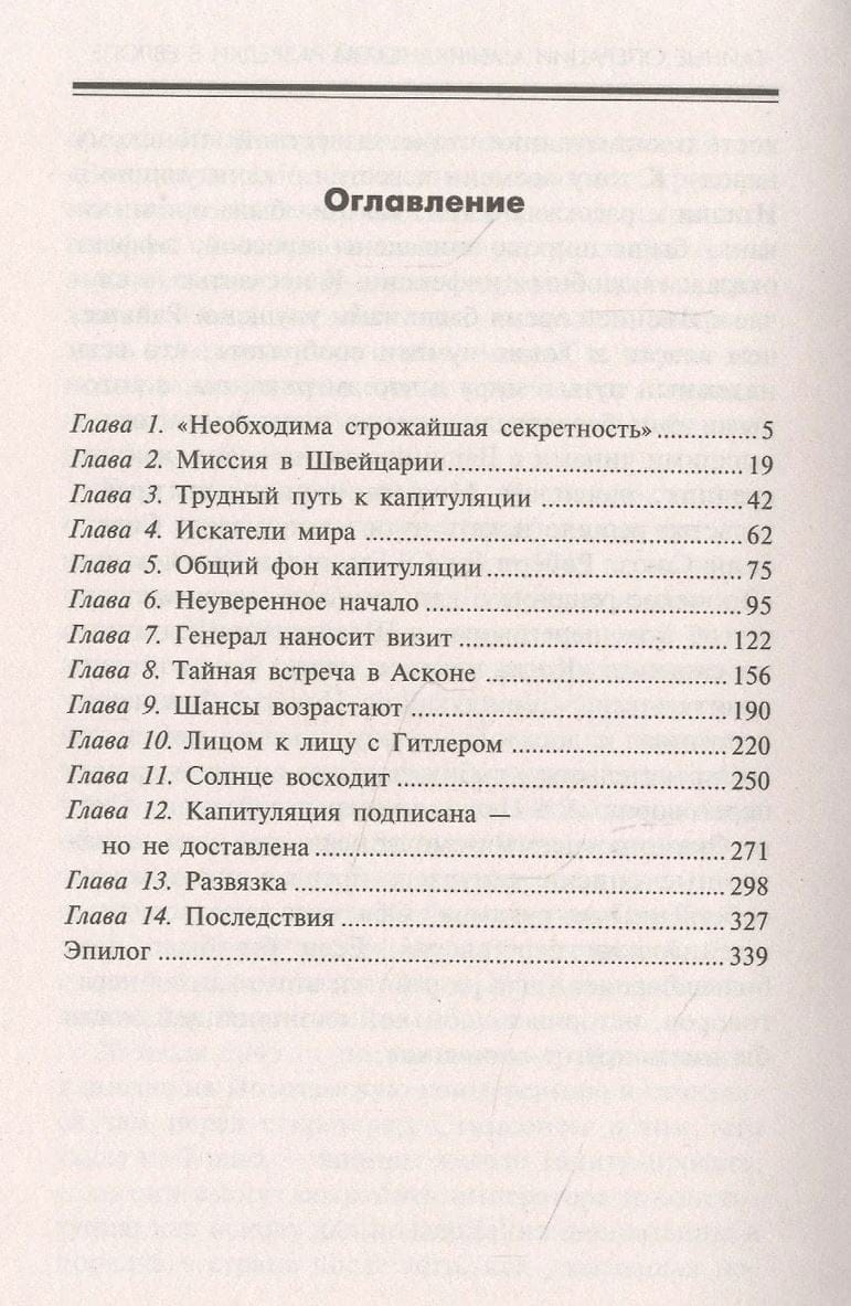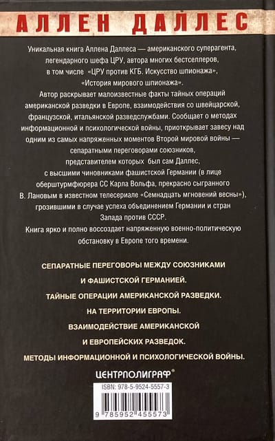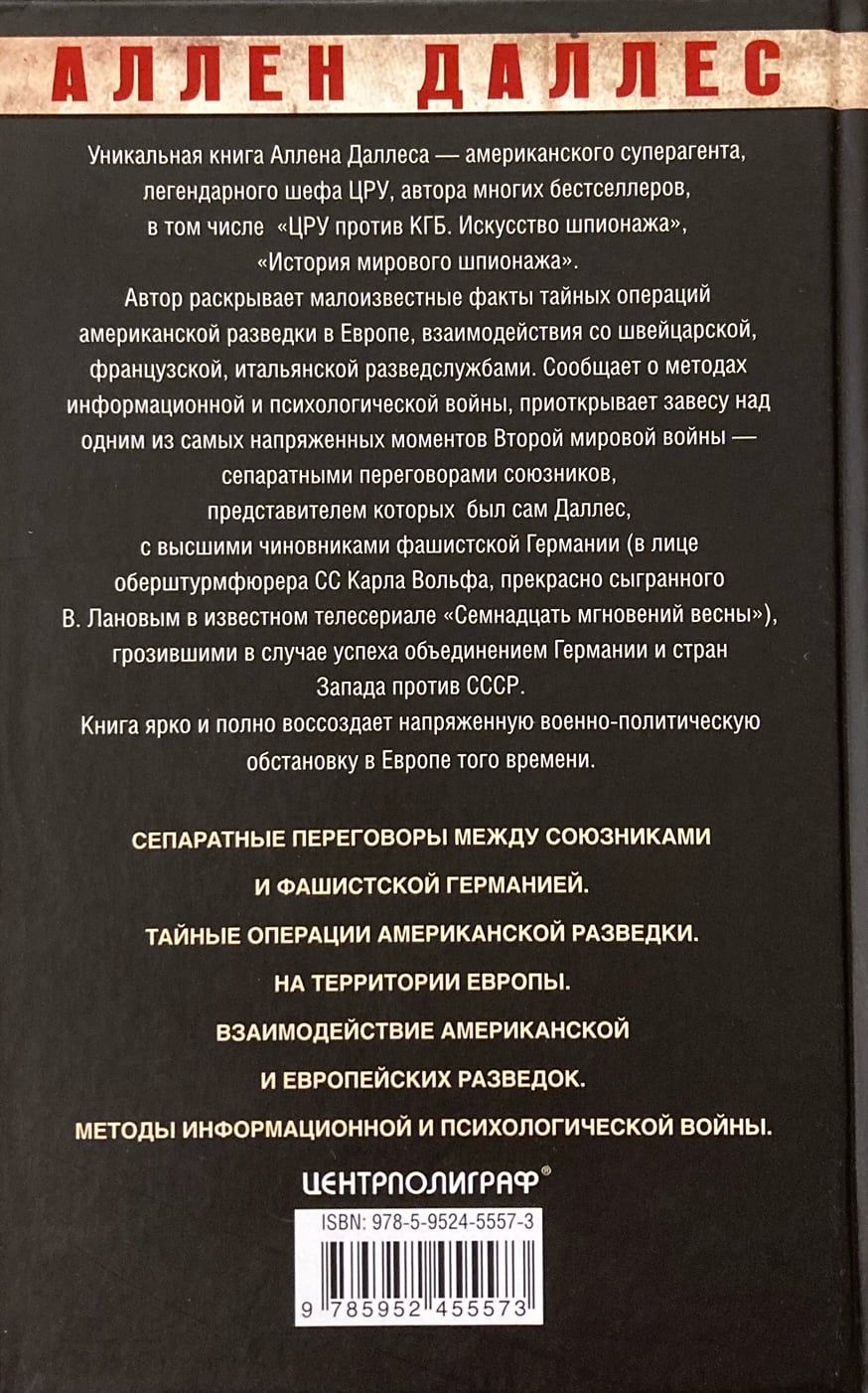 A unique book written by Allen Dulles, an American super agent and legendary CIA chief. The author reveals little-known facts about the secret operations of American intelligence in Europe. He talks about the Swiss, French, and Italian intelligence services, methods of information and psychological warfare. He also lifts the curtain on one of the most tense and little-known moments of World War II - the separate negotiations between the allies, whose representative was Dulles himself, and the highest officials of Nazi Germany.