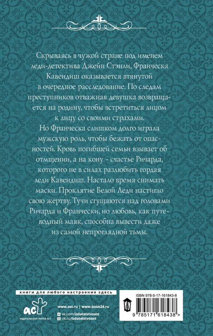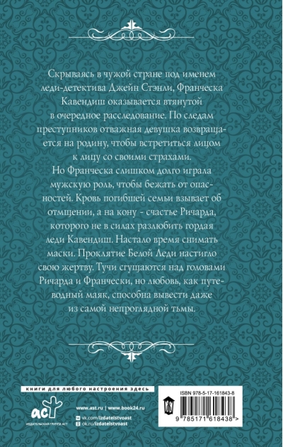 Hiding in a foreign country under the name of Lady Detective Jane Stanley, Francesca Cavendish finds herself drawn into another investigation. Following the trail of criminals, the brave girl returns to her homeland to face her fears. But Francesca has played the male role for too long to run from danger. The blood of a dead family cries out for vengeance, and at stake is the happiness of Richard, whom the proud Lady Cavendish is unable to fall out of love with. It's time to unmask. The curse of the White Lady has claimed its victim. The clouds are gathering over the heads of Richard and Francesca, but love, like a guiding beacon, can lead even from the most impenetrable darkness.