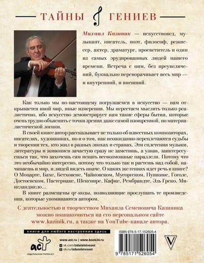 In his book, he talks not only about famous composers, writers, artists, but also about how the fates and creations of those who lived in different eras and countries are unexpectedly intertwined. These intertwining of music, literature and painting are often not immediately noticeable, but once you know, you become so interested that you want to look for all kinds of parallels yourself. Because it is extremely interesting, because only in this way you grow above yourself, you start to see the world and people differently. What geniuses are we talking about in the book? Mozart, Bach, Beethoven, Tchaikovsky, Mussorgsky, Pushkin, Gogol, Dostoevsky, Pasternak, Shakespeare, Kafka, Rembrandt, El Greco, Michelangelo....