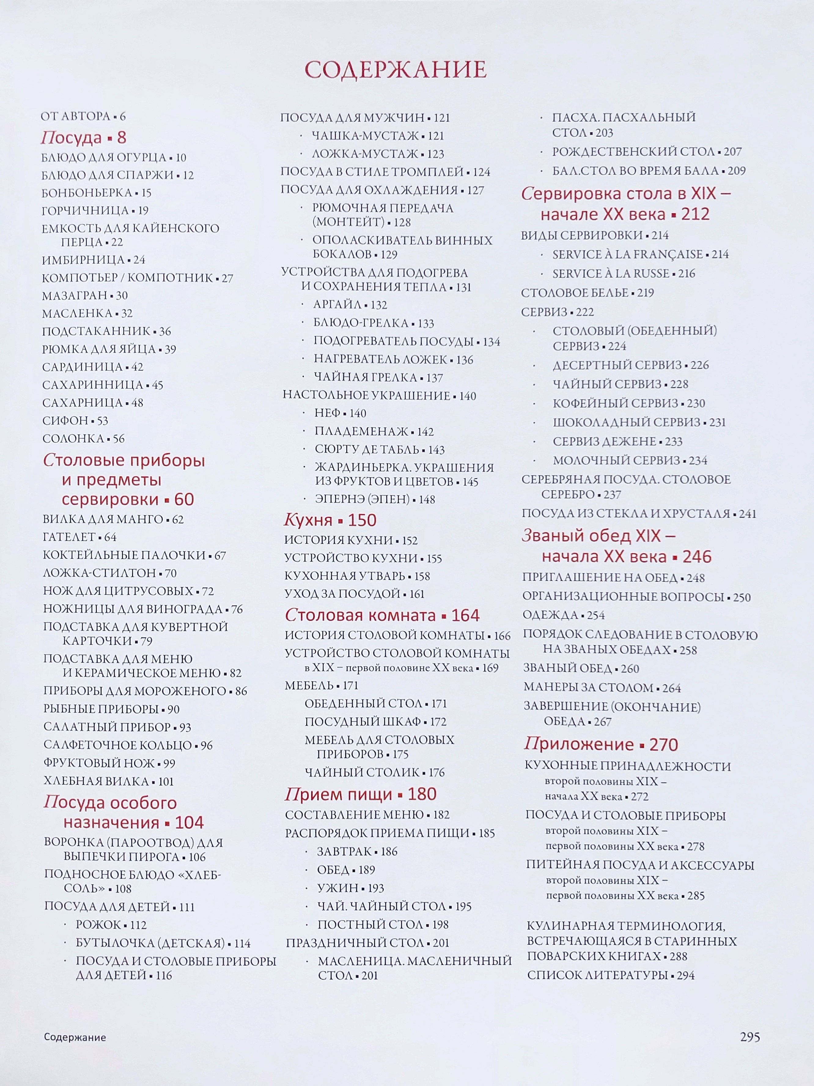 The publication continues the series of books on antique household items and is devoted to tableware, cutlery and table setting rules, table etiquette. It is a collector's and researcher's view of food traditions and culture through objects related to the preparation, serving and consumption of food. With new products, new types of dishes and cutlery appeared, new traditions were formed, and new rules of etiquette were developed. Food is an integral part of human history and culture, and changes in diet and etiquette are often just an echo of deeper processes in the political, cultural, economic and even ideological sphere. The author proposes to look not only at the history of objects, but also at History through objects. The book includes both things forgotten today and things that are commonplace to us but have changed beyond recognition over time.