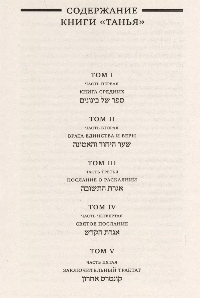The new Russian translation of Tanya is provided with detailed notes, a lengthy glossary explaining the basic terms of Kabbalah and Hasidism, and an extensive reference apparatus. The first volume of the multivolume edition included the first part of this work - the Book of Mediums, including the text in the original language.