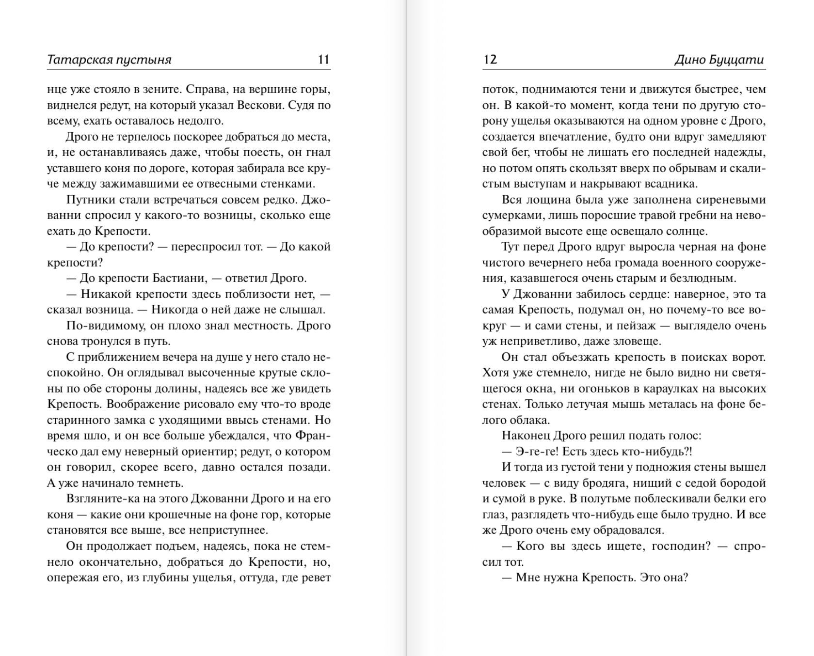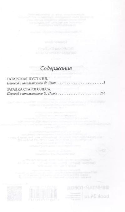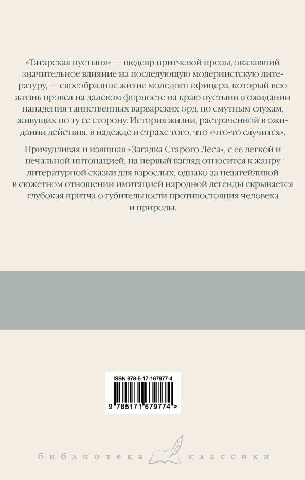 "Tatar Desert" - a masterpiece of parable prose, which had a significant influence on subsequent modernist literature - a kind of hagiography of a young officer who has spent his entire life on a remote outpost on the edge of the desert, waiting for the attack of mysterious barbarian hordes, according to vague rumors living on the other side of it. A story of a life squandered waiting for action, hoping and fearing that "something will happen".