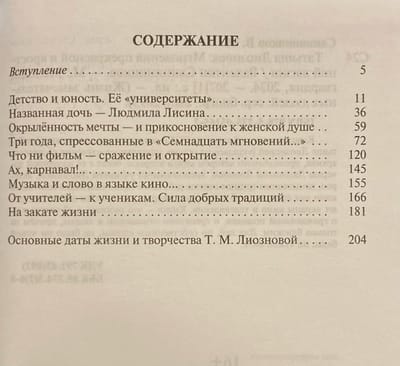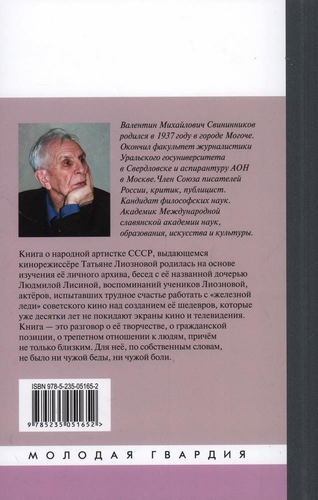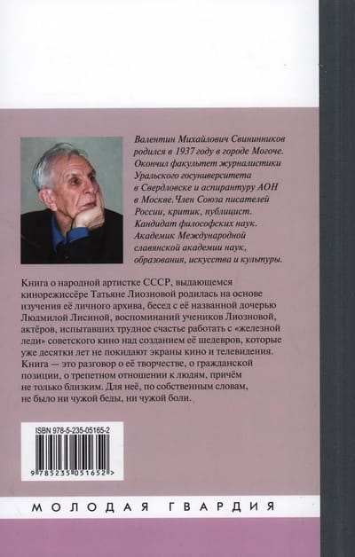The book about the People's Artist of the USSR, outstanding film director Tatyana Lioznova was born on the basis of a thorough study of her personal archive, conducted by the author of the book for the first time, conversations with her named daughter Lyudmila Lisina, memories of Lioznova's students, actors who experienced the difficult happiness of working with the "Iron Lady" of Soviet cinema to create her masterpieces, which have not left the screens of cinema and television for decades. The book is a conversation about her work, about her civic position, about the reverent attitude to people, and not only close ones. For her, in her own words, there was no other people's misfortune or pain.