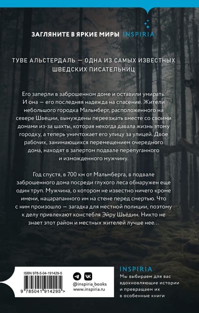 The residents of Malmberg, a small town in northern Sweden, are being forced to move their homes because of a mine that once gave life to the town but is now destroying it street by street. Two workers moving another house find a terrified and exhausted man in a locked basement. A year later, 700 kilometers from Malmberg, another corpse is found in the basement of an abandoned house in the middle of a remote forest. A man who is unknown except for a name scrawled on the wall before he died. What happened to him is a mystery to the local police, so Constable Eira Sjödin is brought in. No one knows the neighborhood and the locals better than she does....
