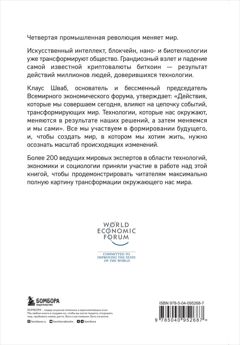 The Fourth Industrial Revolution is changing the world. Artificial intelligence, blockchain, nano- and biotechnology are already transforming society. The tremendous rise and fall of the most famous cryptocurrency, bitcoin; the result of the actions of millions of people who put their trust in technology. Klaus Schwab, founder and permanent chairman of the World Economic Forum, says: The actions we take today influence a chain of events that will transform the world. The technologies that surround us change as a result of our decisions, and then we change ourselves. We all have a part in shaping the future, and to create the world we want to live in, we need to realize the magnitude of the changes taking place. More than 200 of the world's leading experts in technology, economics, and sociology contributed to this book to give readers the fullest possible picture of the transformation of the world around us.
