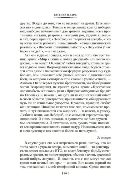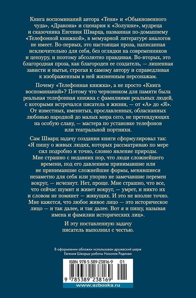 The book of memoirs of the author of "The Shadow" and "Ordinary Miracle", "The Dragon" and the script for "Cinderella", the sage and storyteller Evgeny Schwartz, called "The Phone Book", has no analogues in memoir literature. First, it is a real prose, written exclusively for himself, without regard for contemporaries and censorship, and therefore absolutely truthful. Secondly, it is a noble prose, as noble as its creator - devoid of envy and whining, strict to the author himself and fair to the characters depicted in it. Why "The Phone Book" and not just "The Book of Memories"? Because the draft for the memoir was a real phone book with the names of real people the writer met in life - from "A" to "I". From the famous, famous, celebrated, enamored with the love of the people to the small world of this world, not pretending to special fame - a master at installing telephones or theatrical dressmaker. Shvarts himself formulated the task of creating the book as follows: "I write about living people, which I consider to the best of my ability in detail and accurately, like a phenomenon of nature. I have recently been afraid that people of the most complex time, who under its pressure took or did not take the most complex forms, who changed imperceptibly for themselves or persistently did not notice the changes around them, would disappear. No, it's simpler than that. I'm afraid that everything that is noisy and living around me now will die, and no one will remember them - the living ones. And that's not quite accurate. It seems to me that any living face is a historical face - and so on and so forth. So I write, calling names and surnames of historical persons". And this task the writer fulfilled with honor.