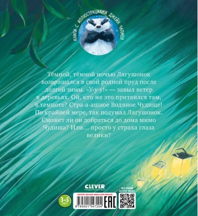 One dark, dark night, Froggy was returning home to his pond after a long winter. The wind was howling eerily when he saw someone scary lurking in the thicket. It must be the Water Monster! Froggy turned to his friends for help, but each time the Behemoth got scarier and scarier..... until... until they realized that all along they had only been afraid of their own shadows. It's true what they say: "Fear is great."