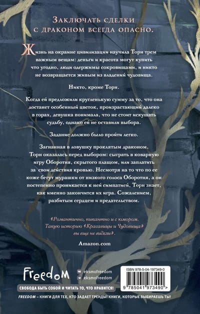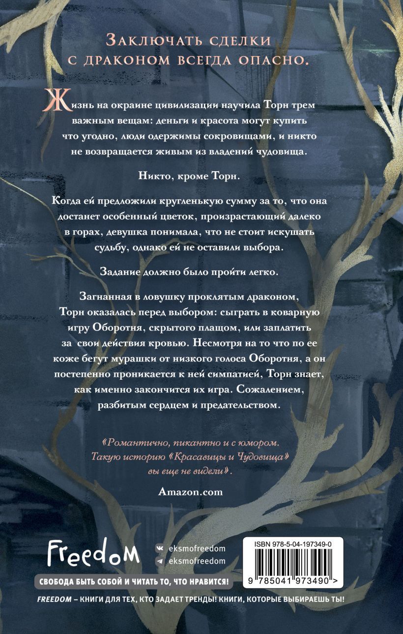 Making deals with a dragon is always dangerous. Living on the fringes of civilization has taught Thorn three important things: money and beauty can buy anything, people are obsessed with treasure, and no one comes back alive from a monster's domain. No one, that is, except Thorn. When she was offered a tidy sum of money for getting a special flower growing far away in the mountains, the girl knew she shouldn't tempt fate, but she was left with no choice. The task should have been easy. Trapped by a cursed dragon, Thorn was faced with a choice. Play the Werewolf's insidious game, hidden by the cloak, or pay for her actions in blood. Though goosebumps run down her skin at the Werewolf's low voice and he's slowly developing a liking for her, Thorn knows exactly how their game will end. Regret, heartbreak, and betrayal.
