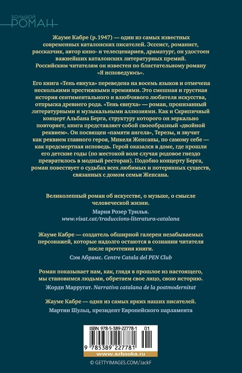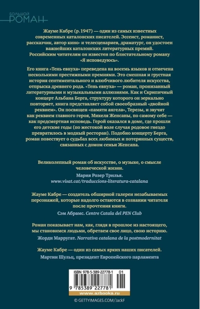 The novel by the distinguished Catalan writer Jaume Cabré, "The Shadow of the Eunuch," is a humorous and sad story of a sentimental and amorous art lover, a scion of the ancient Gensana family, who, in search of the Way, Truth, and Life, dedicated his student years to armed struggle for justice. "The Shadow of the Eunuch" is a novel permeated with literary and musical allusions. Like Alban Berg's Violin Concerto, whose structure it mirrors, the book is a unique "double requiem." Dedicated to the "memory of an angel," Teresa, it also sounds like the protagonist's, Miquel Gensana's, requiem for himself. The story reads like a deathbed confession. The protagonist finds himself in the house where he spent his childhood (by a cruel twist of fate, the family home has been transformed into a fashionable restaurant). Like Berg's concerto, the novel recounts the destinies of all the loved and lost souls connected to the Gensana house.