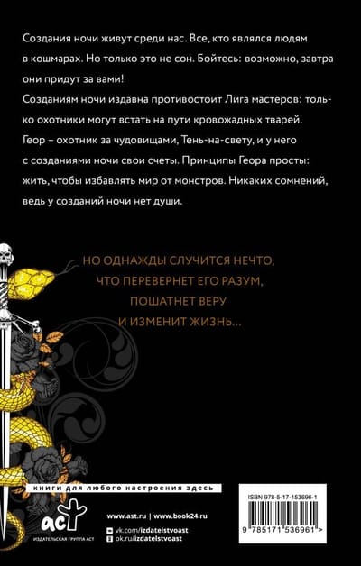 Creatures of the night live among us. All those who have appeared in people's nightmares. Only this is not a dream. Fear, they may be coming for you tomorrow! The Night Creatures have long been opposed by the League of Masters: only hunters can stand in the way of the bloodthirsty creatures. Geor is a monster hunter, Shadow-on-light, and he and the creatures of the night have a score to settle. Geor's principles are simple: live to rid the world of monsters. No doubt about it, for the creatures of the night have no souls. But one day something happens that will turn his mind upside down, shake his faith and change his life....