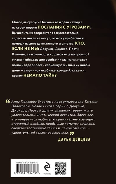 The young couple Olkhovs now and then find threatening messages on their doorstep. Identify their sender independently addressees can not, so resort to the help of our detective agency. Who, if not us: the Girl, the Joker, the Poet and Clement, who know each other from their past lives and have special talents, can help the couple find a peaceful life in their new home - an old mansion, which seems to hold many secrets?