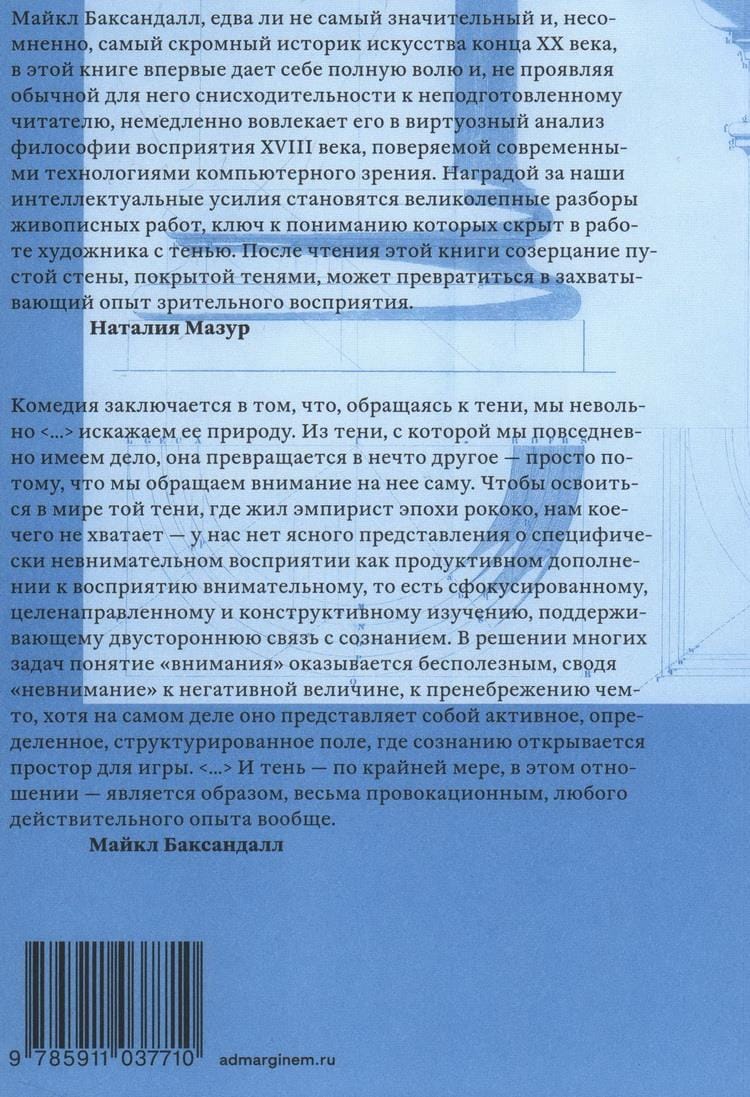 This book by the British art historian Michael Baxandall (1933-2008), one of the founders of visual culture studies, is organized around several questions intertwined in its title. How important was the problem of the shadow in the scientific and artistic pursuits of the Enlightenment, how were these pursuits interconnected, and how did they resonate in the informatics of the second half of the twentieth century? What is the Enlightenment significance of the shadow, that is, what is its cognitive value? Finally, what is the technical function of the shadow in perception, in the visual arts, and in information technologies such as robotics? Behind all these questions lies the more general problem of understanding shadow as a cognitive phenomenon, and around them an interdisciplinary network is forming, revealing unexpected and instructive intersections between eighteenth-century physics and optics, rococo painting, and developments in artificial intelligence in the 1970s and 1980s.