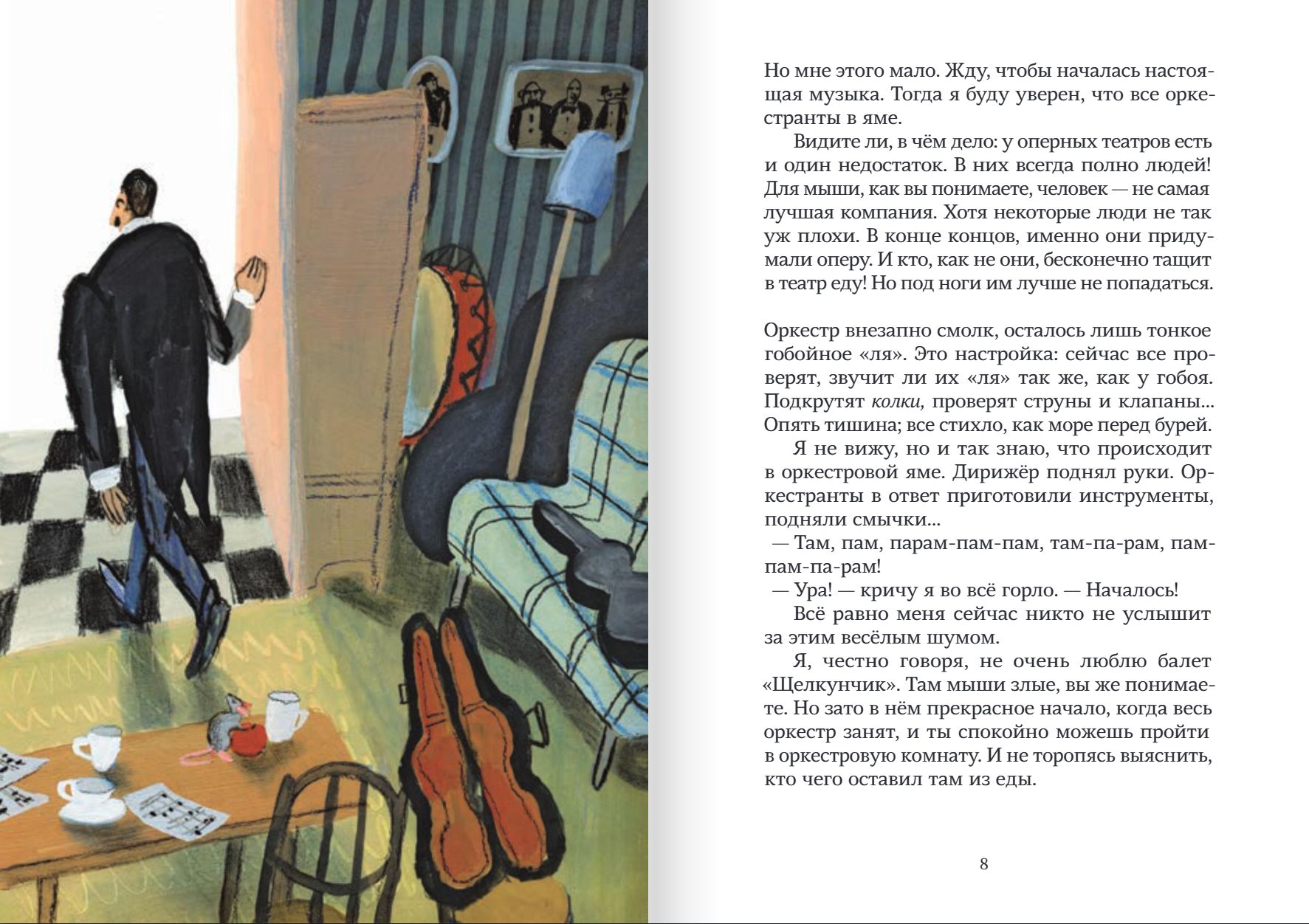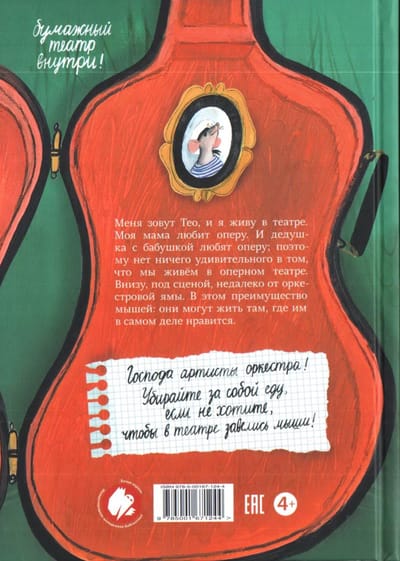 Nina Dashevskaya is a professional musician, so her books are full of music. In "Theo, Theater Captain," the life of an orchestra and musical theater is revealed to young readers from a completely unusual perspective—it's told through the mice, who live in the theater as if they were at home, experiencing their own amazing adventures. At the end of the book, there's a surprise for readers: figurines on stands, musicians, and their instruments. They can use these to form their own orchestra and continue their play at theater—the theater curtain is depicted on one endpaper, and a cross-section of the theater's structure is on the other.