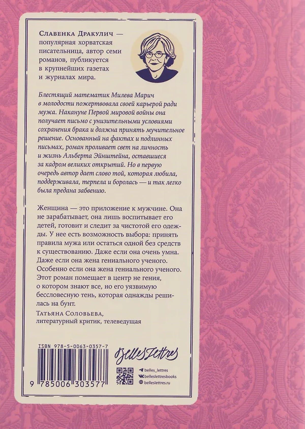 Croatian writer and journalist Slavenka Drakulić tells the story of a woman destined to remain in the shadow of a famous man. Based on facts and authentic letters, the novel sheds light on the personality and life of the man who changed our understanding of space and time. But above all, the author gives voice to the woman who loved, supported, endured, and fought—and was so easily forgotten.