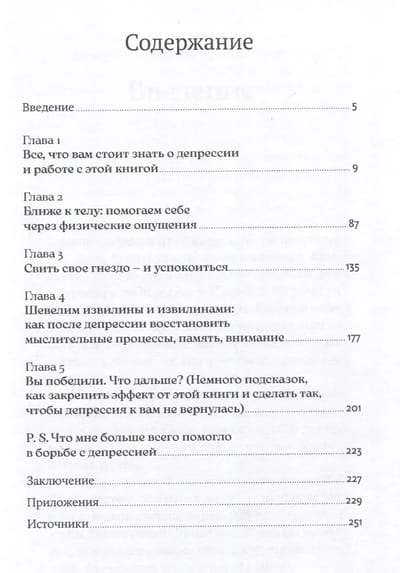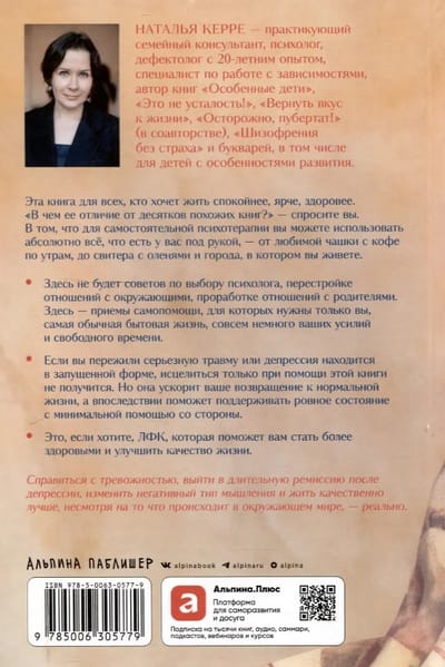 This is a book of practical help for people suffering from depression. Based on her own experience and extensive practice, psychologist Natalia Kerre explains that the support needed to overcome depressive episodes can be found in what surrounds us and in what we enjoy (things, events, feelings, places). The author's method will not require a drastic change in your lifestyle, huge efforts or resources, but it will help you cope with anxiety, achieve long-term remission after depression, change your negative thinking and improve your quality of life.